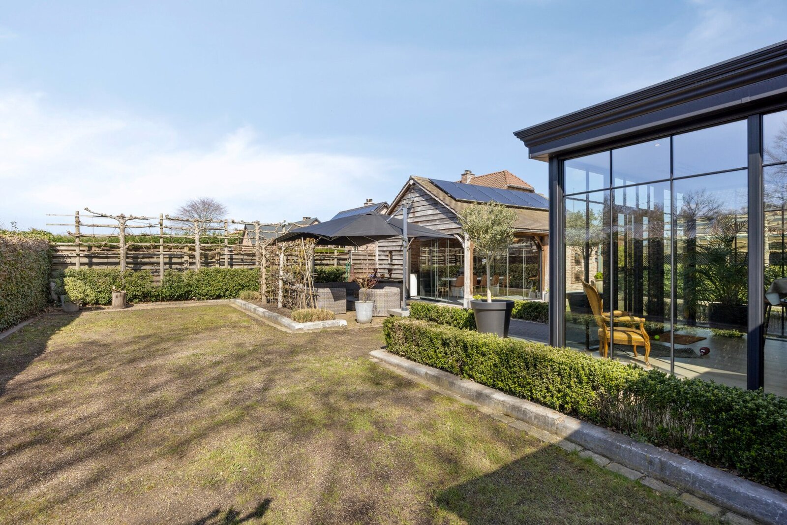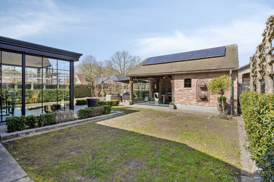 De tuin werd volledig aangelegd en afgesloten. Vooraan zijn er tal van parkeerplaatsen. Achteraan is er een knappe poolhouse met aangrenzend terras voorzien.