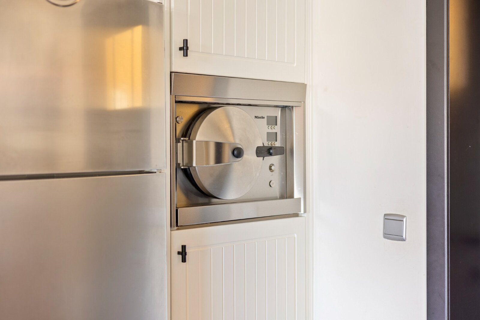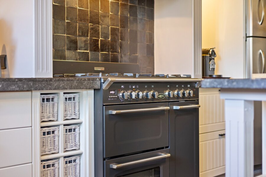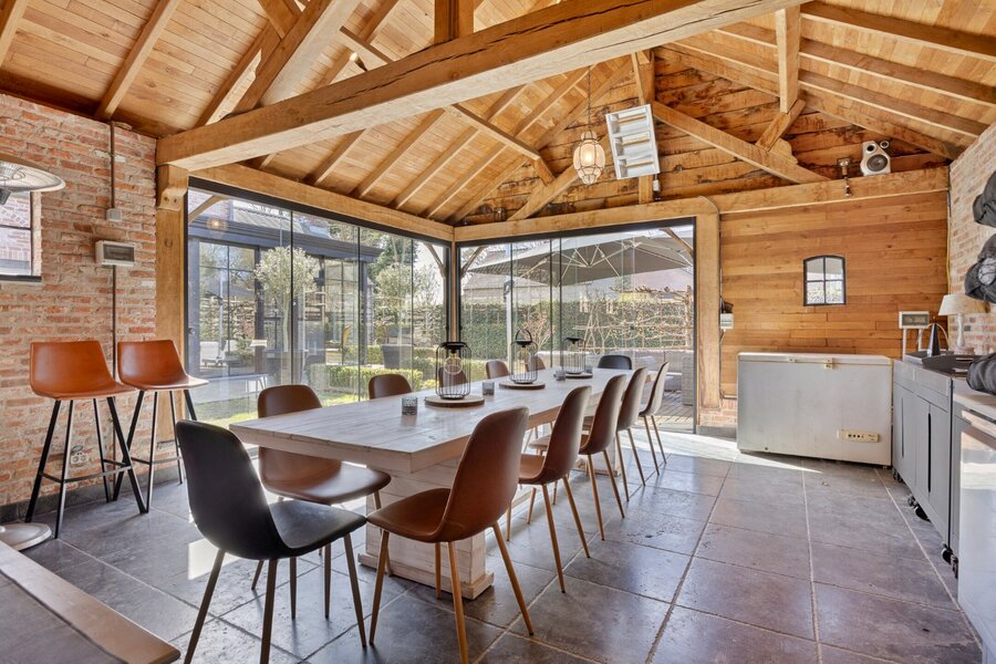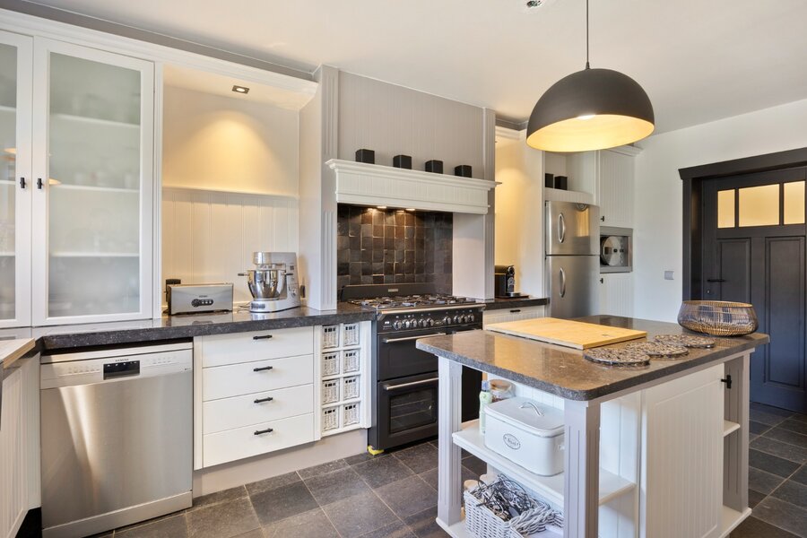 De keuken is volledig uitgerust met een Boretti 5-pits gasvuur met 3 ovens, Miele stoomoven, koelkast met diepvries, vaatwasser en dampkap. Aansluitend is er een wasplaats met ingebouwde kasten, inloopdouche en lavabo. Verder is er een garage met 2 elektrische poorten, voorzien van een zolder.