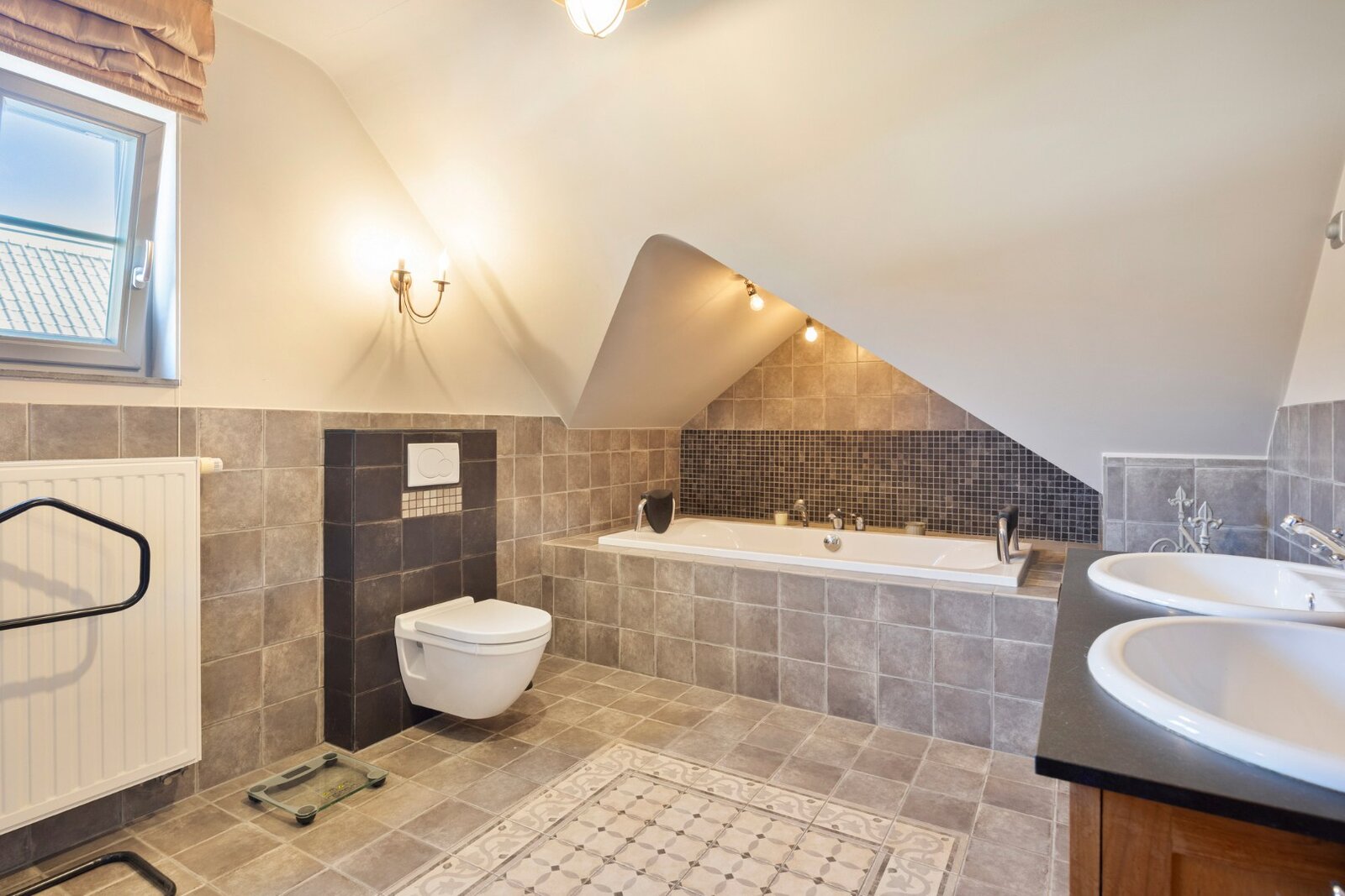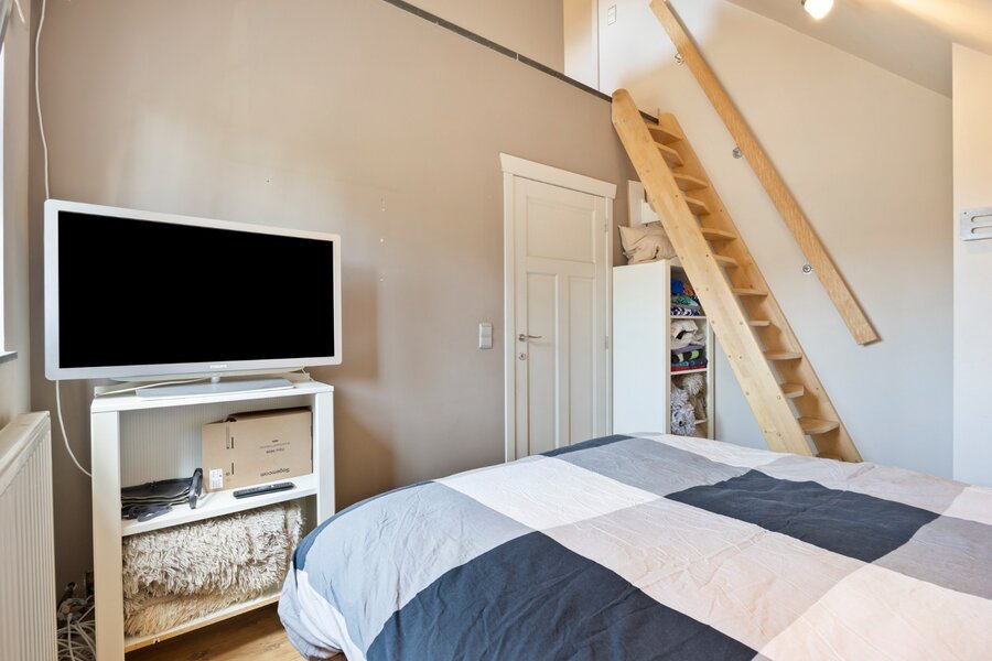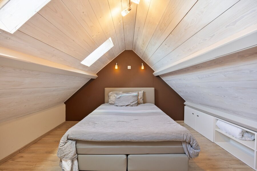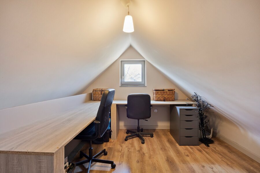 Op de verdieping geeft de nachthal toegang tot 3 slaapkamers, een dressing en een badkamer met groot bad, ruime dubbele inloopdouche, dubbele lavabo en toilet. Eén van de slaapkamers is een kleine kinderkamer, dewelke uitgebreid kan worden door de naastgelegen dressing erbij te betrekken. Vanuit de andere kinderkamer heb je via een vaste ganzentrap toegang tot de zolderverdieping, dewelke heden ingericht is als logeerkamer en bureauruimte. Deze kinderkamer kan ingericht worden als dressing met vaste trap naar de zolderverdieping, dewelke dan kan fungeren als 3de ruime kinderslaapkamer.