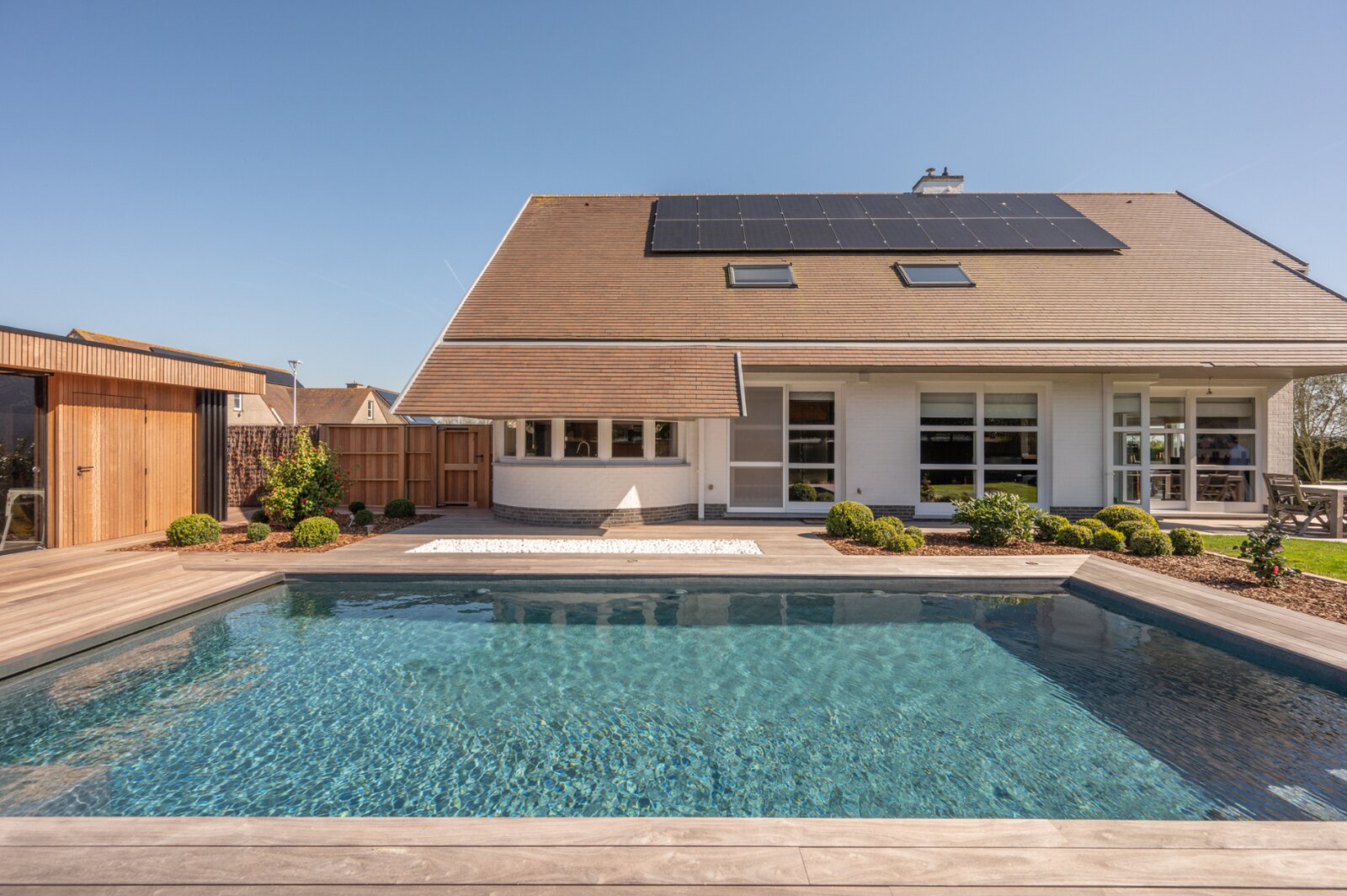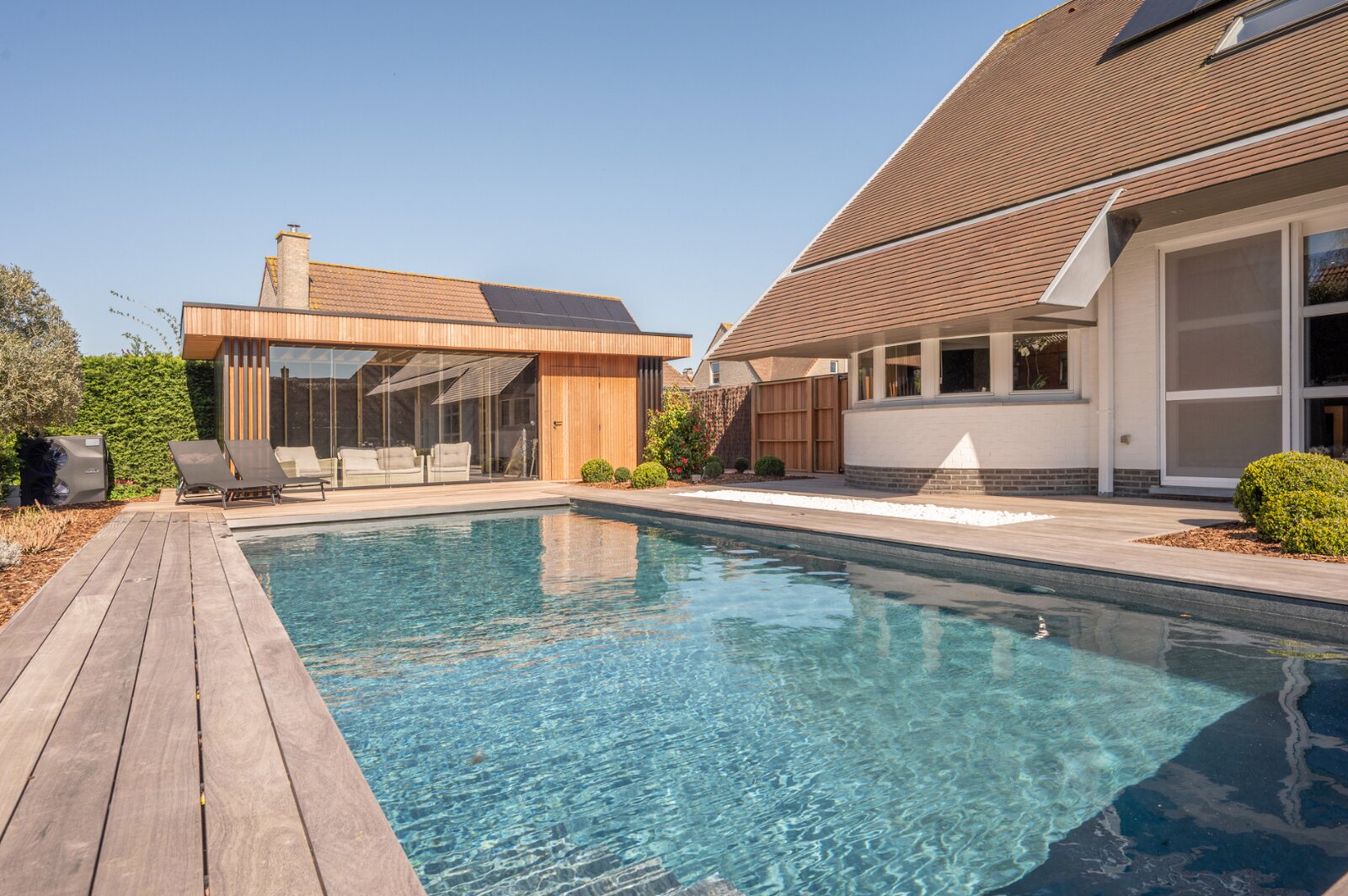 De tuin is praktisch aangelegd en goed onderhouden. Het poolhouse, dat volledig onderkelderd is en nog verder afgewerkt kan worden naar eigen wens, maakt het geheel compleet.