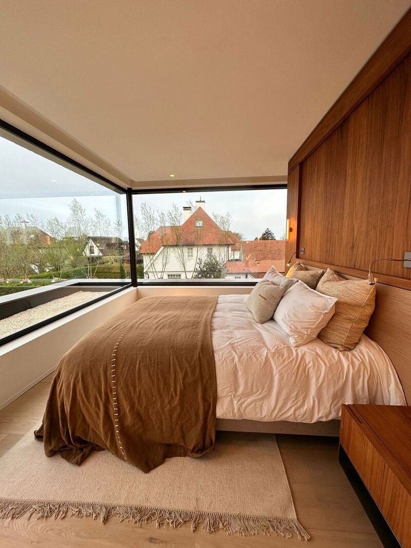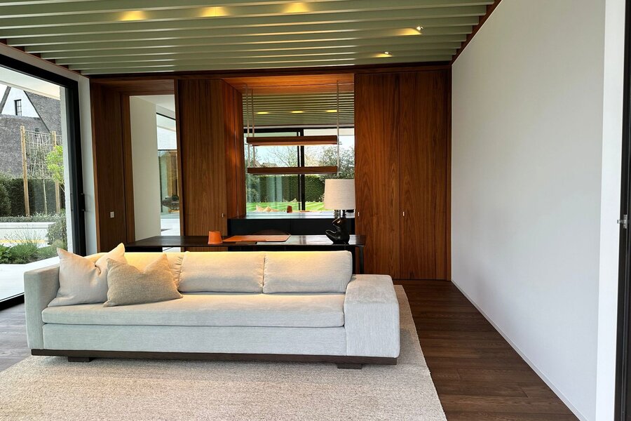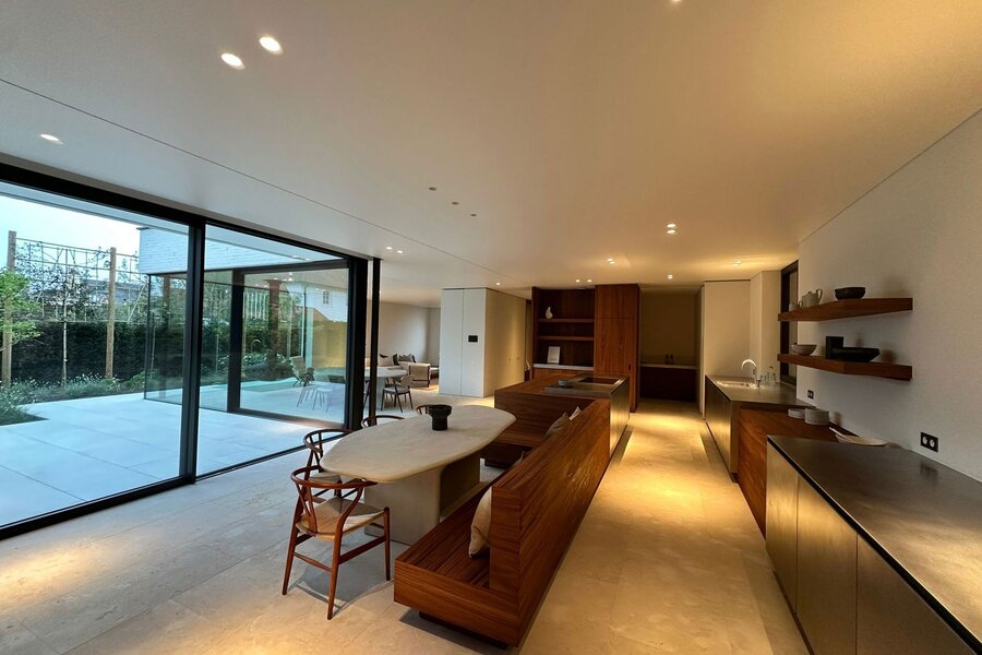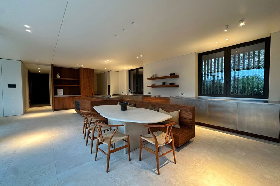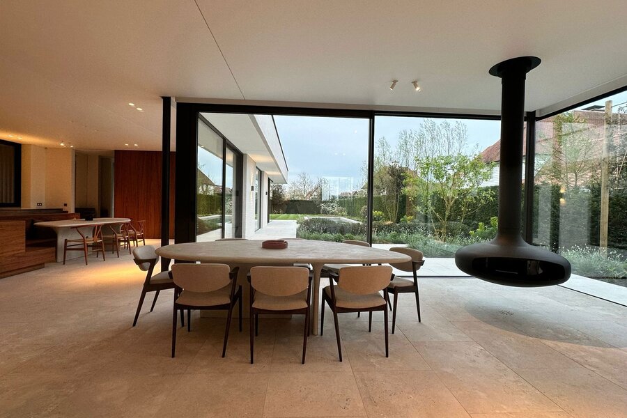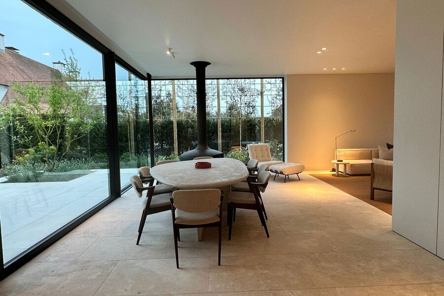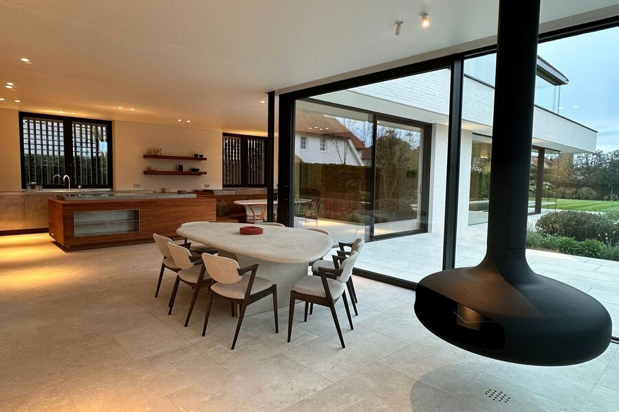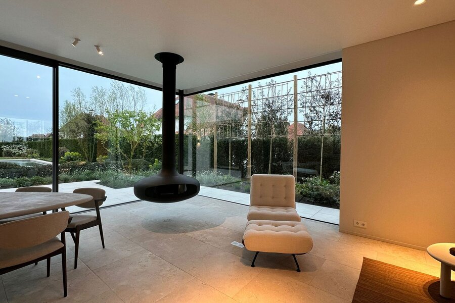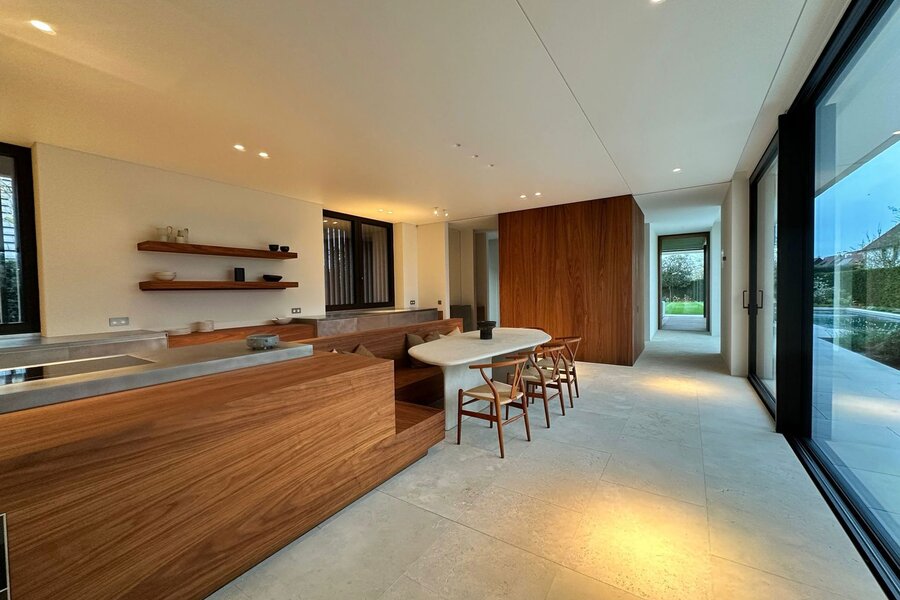 Op het gelijkvloers bevindt zich een royale leefruimte met grote raampartijen die de natuur binnenbrengen en zorgen voor een open en aangename sfeer. De volledig uitgeruste keuken sluit naadloos aan op de eetruimte en vormt het centrale hart van de woning, aangevuld met een aparte tv-hoek. Een lift verbindt alle verdiepingen discreet en praktisch.