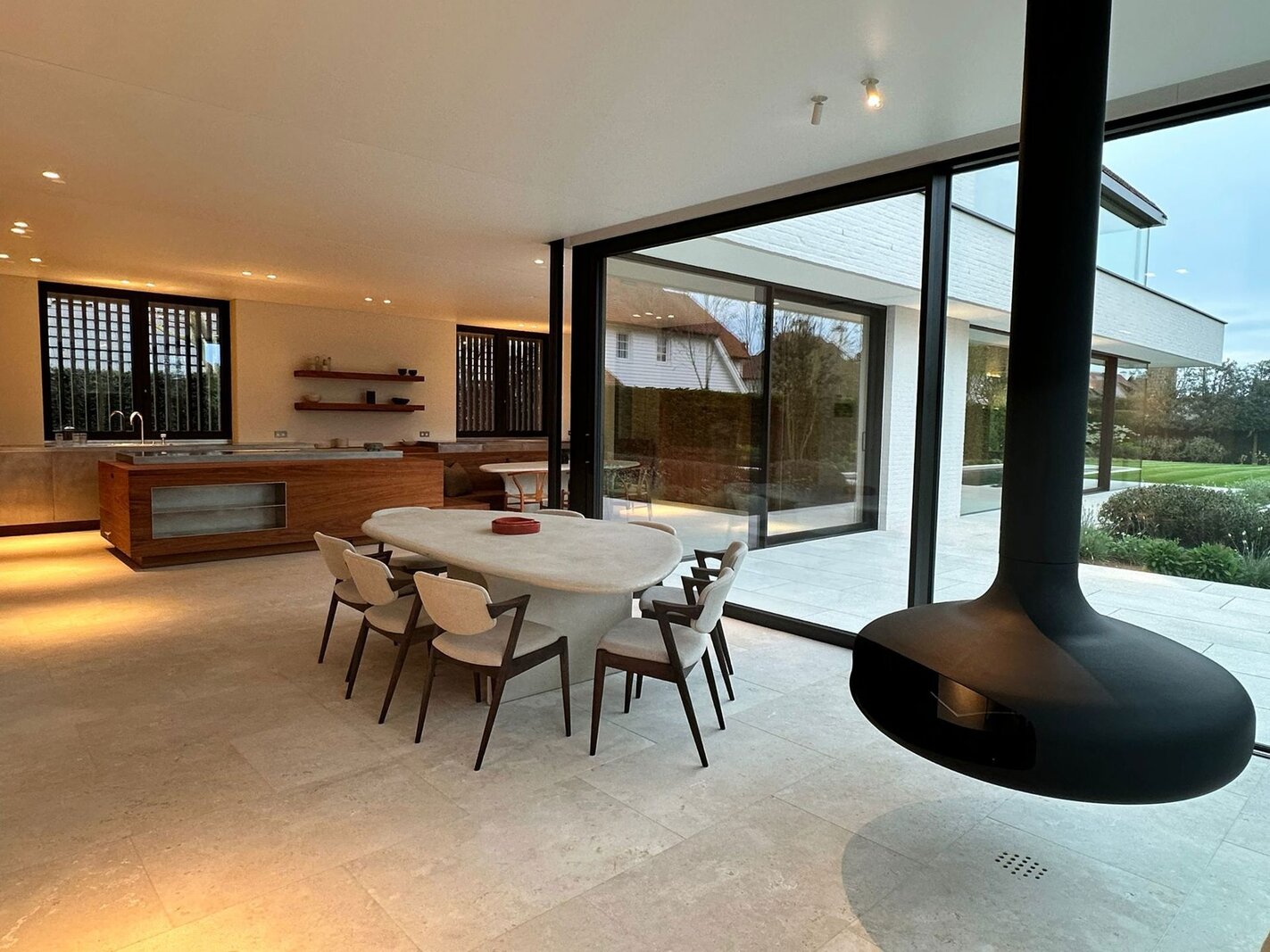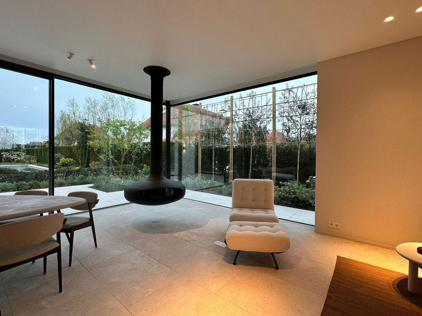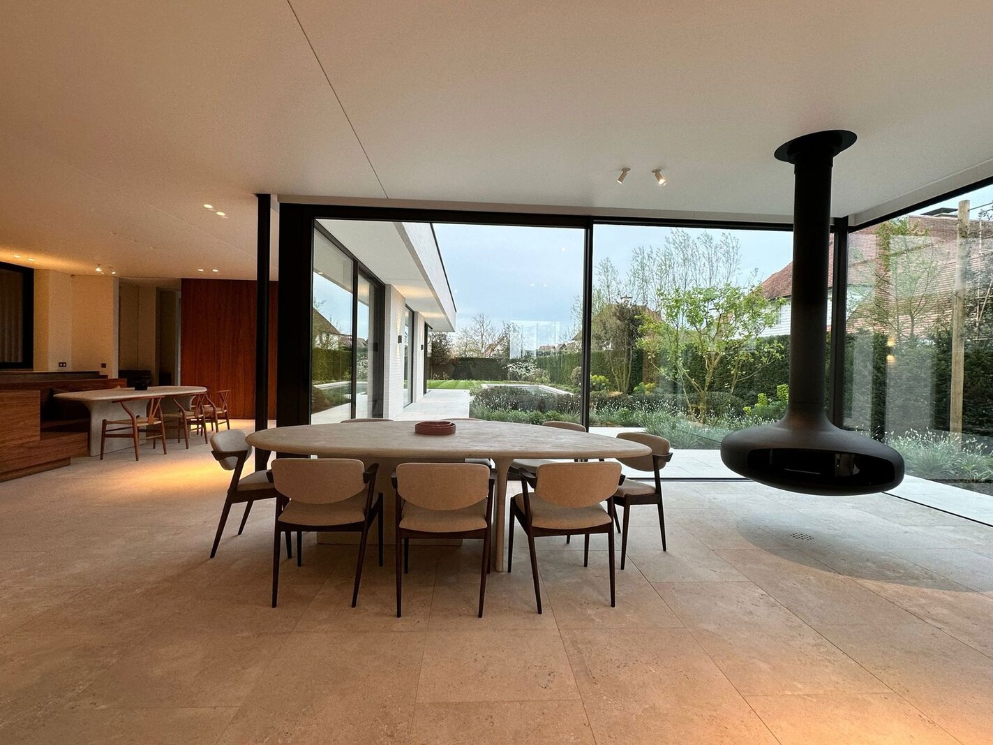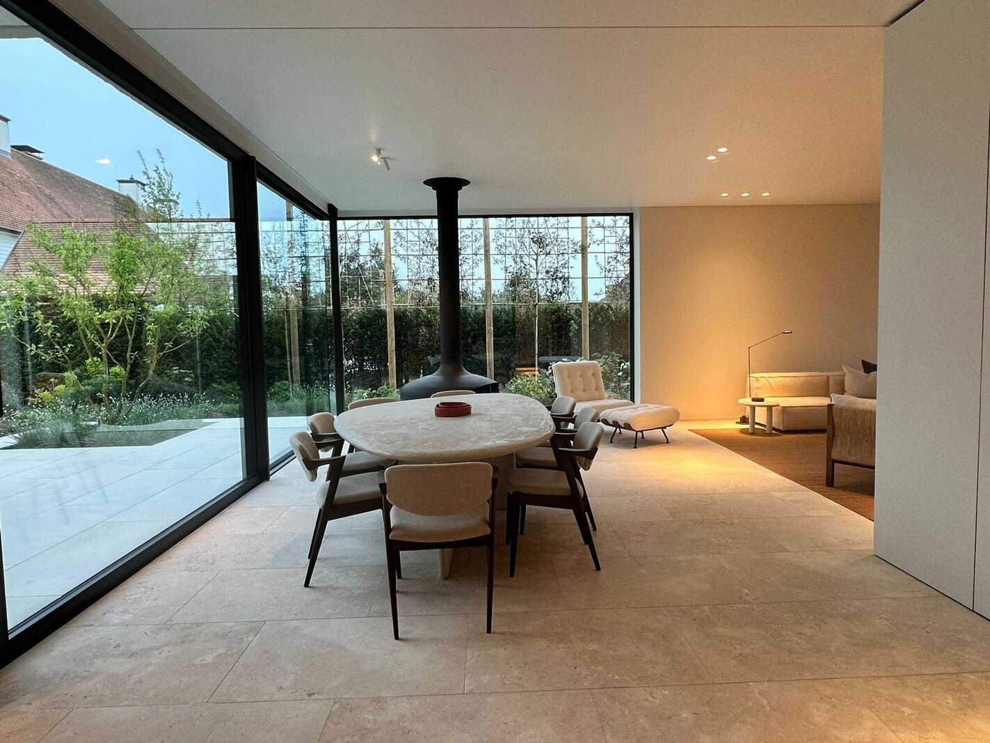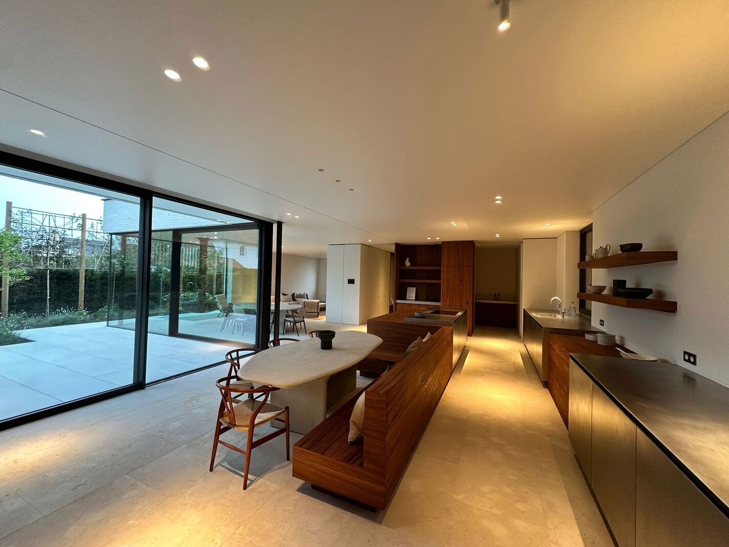 Op het gelijkvloers bevindt zich een royale leefruimte met grote raampartijen die de natuur binnenbrengen en zorgen voor een open en aangename sfeer. De volledig uitgeruste keuken sluit naadloos aan op de eetruimte en vormt het centrale hart van de woning, aangevuld met een aparte tv-hoek. Een lift verbindt alle verdiepingen discreet en praktisch.