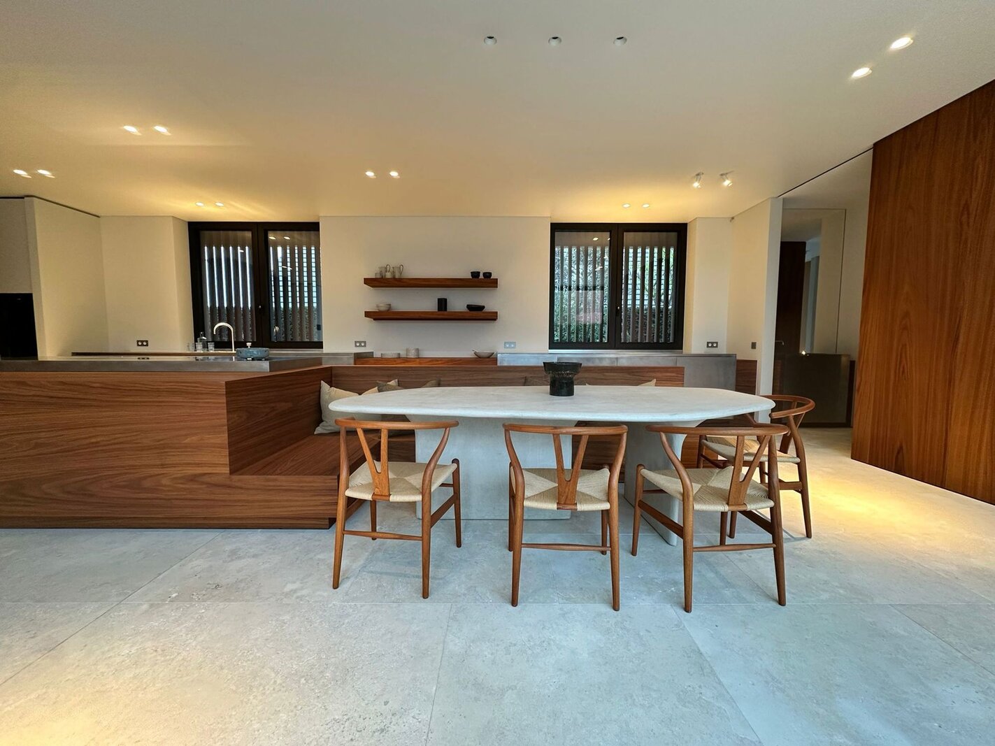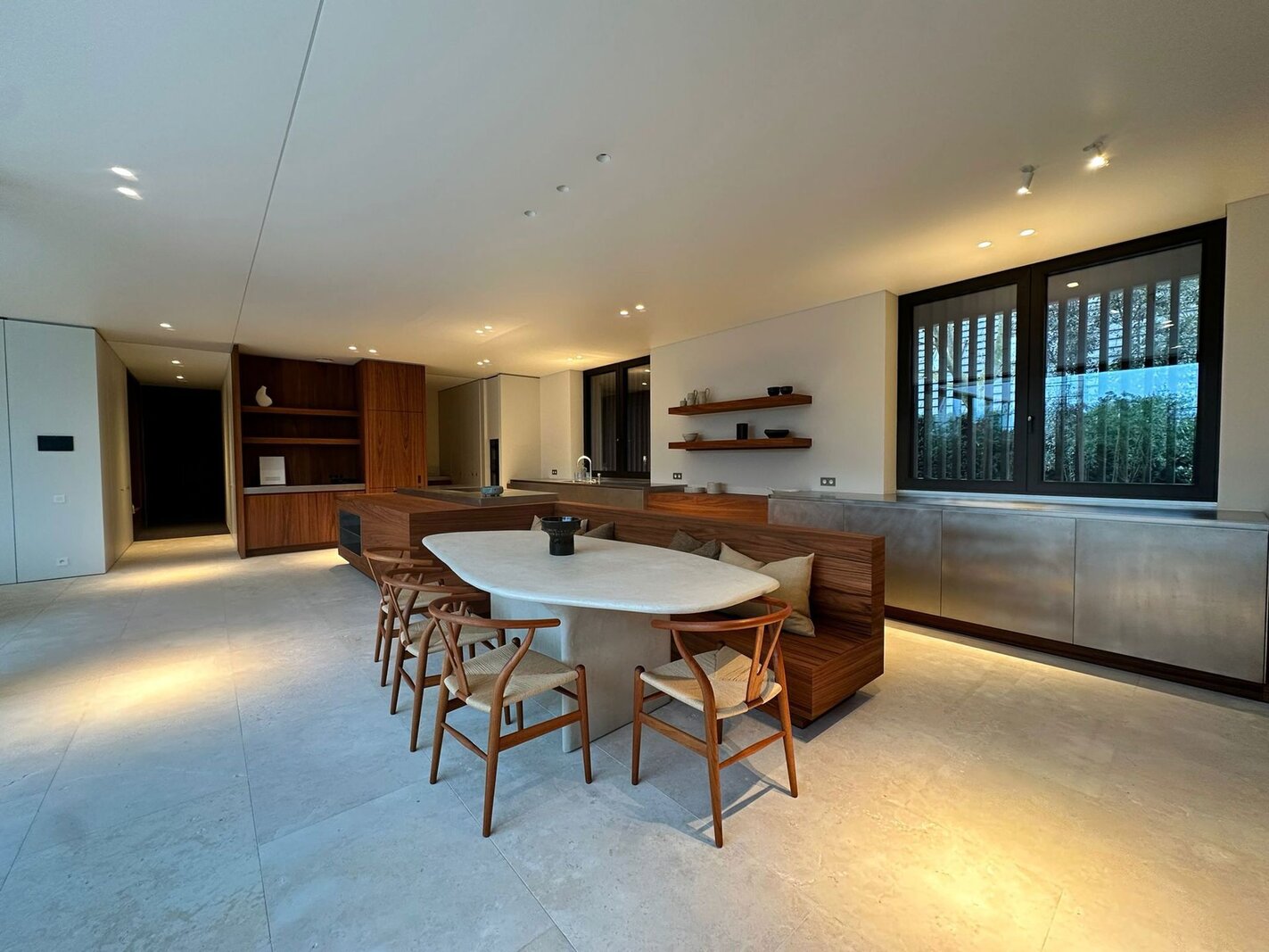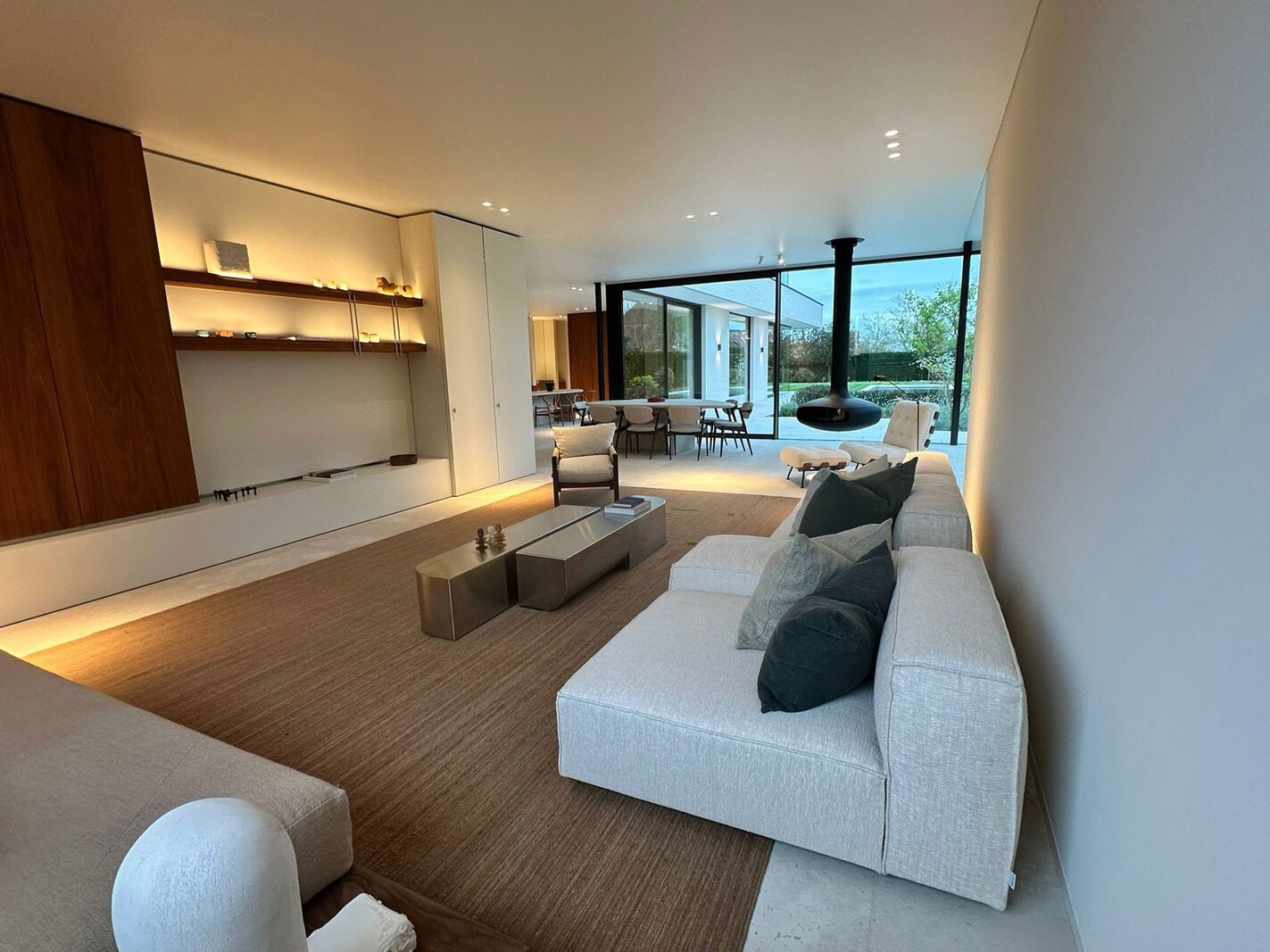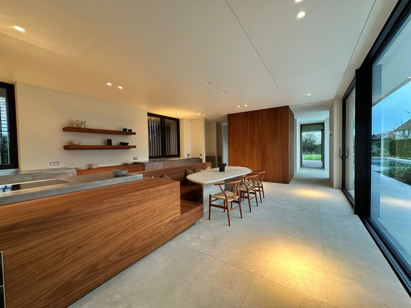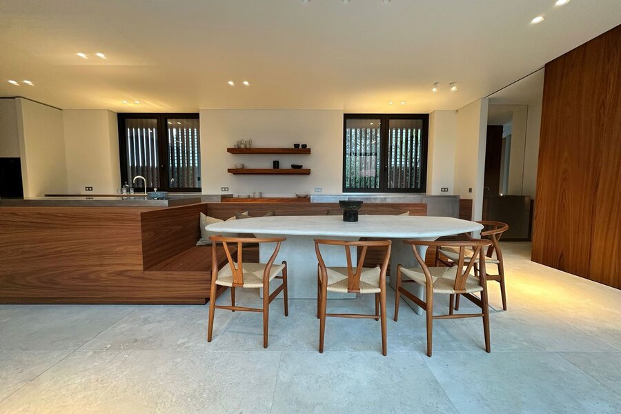 Op het gelijkvloers bevindt zich een royale leefruimte met grote raampartijen die de natuur binnenbrengen en zorgen voor een open en aangename sfeer. De volledig uitgeruste keuken sluit naadloos aan op de eetruimte en vormt het centrale hart van de woning, aangevuld met een aparte tv-hoek. Een lift verbindt alle verdiepingen discreet en praktisch.