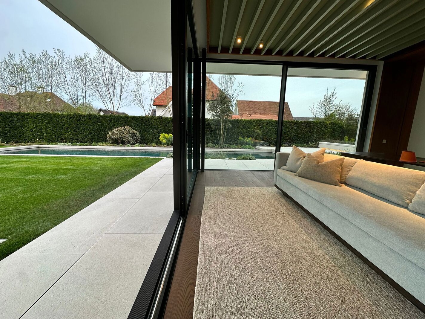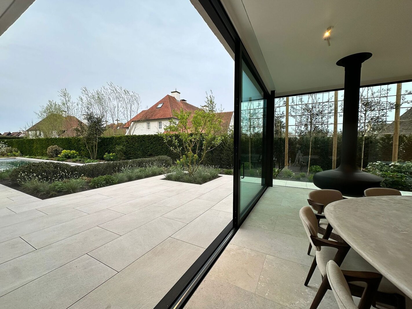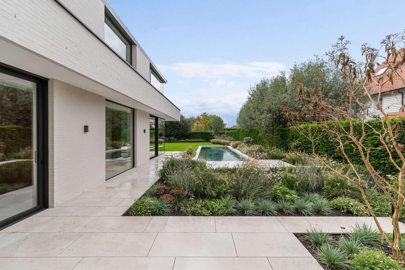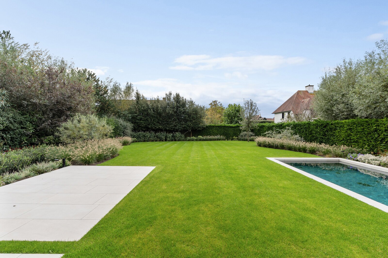 De tuin is volledig aangelegd en vormt een oase van rust met een privézwembad, meerdere terrassen, geïntegreerde verlichting en beregening.