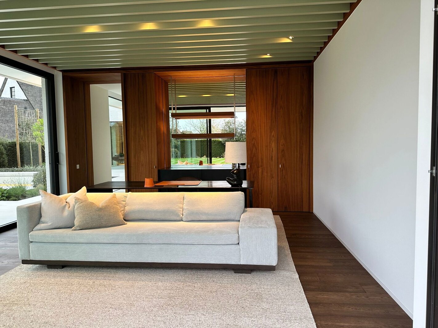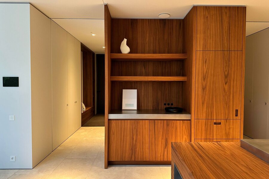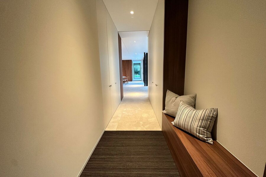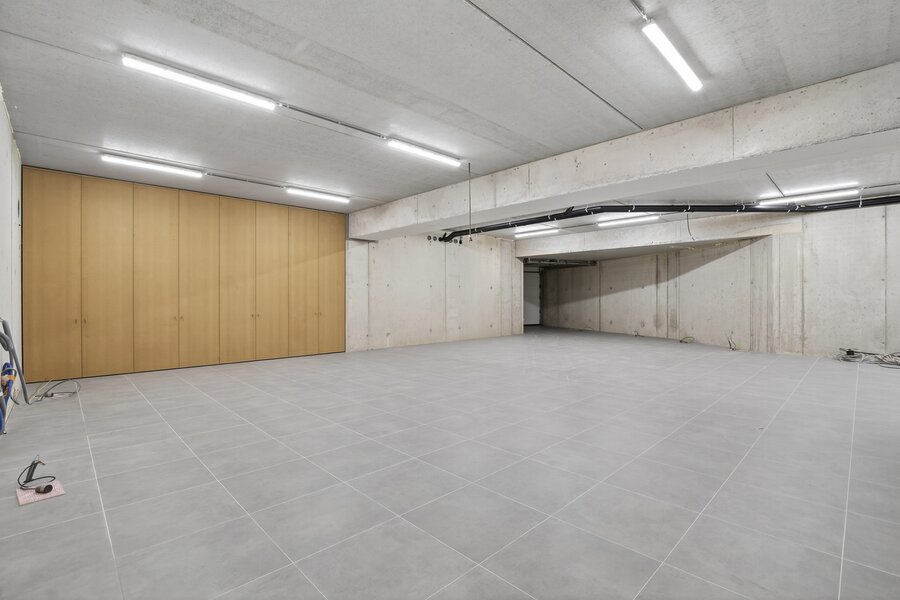 Ondergronds beschikt de woning over een ruime garage met autolift voor meerdere wagens, een discrete fietsenberging en een hoogwaardig afgewerkte wijnkelder.