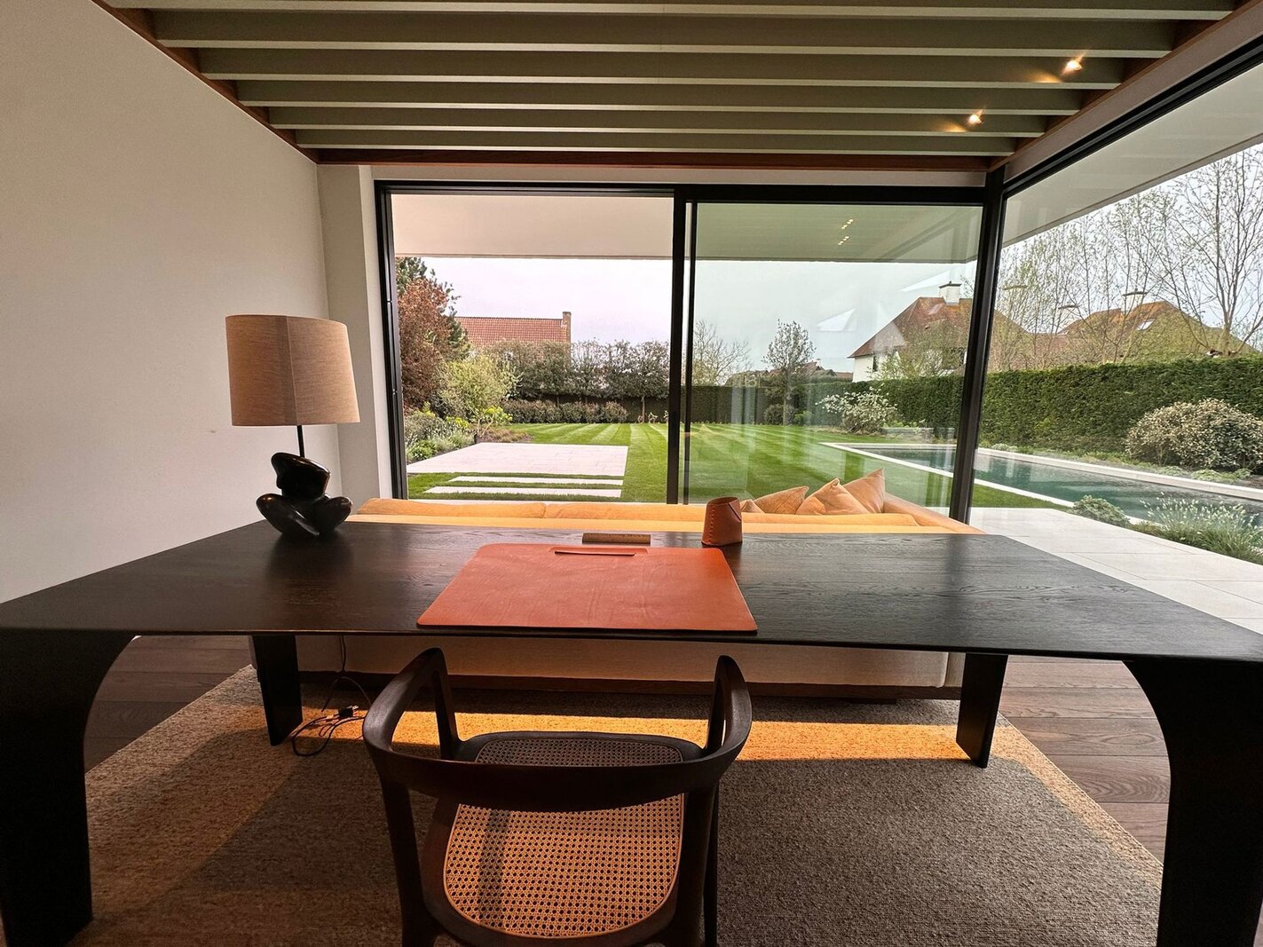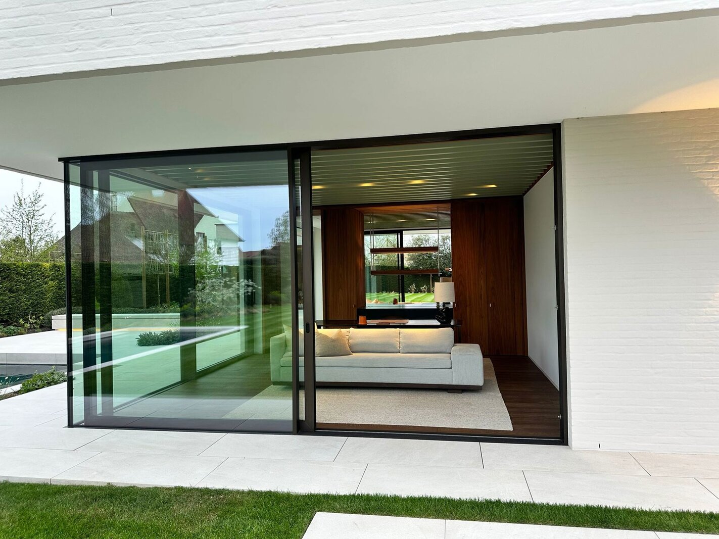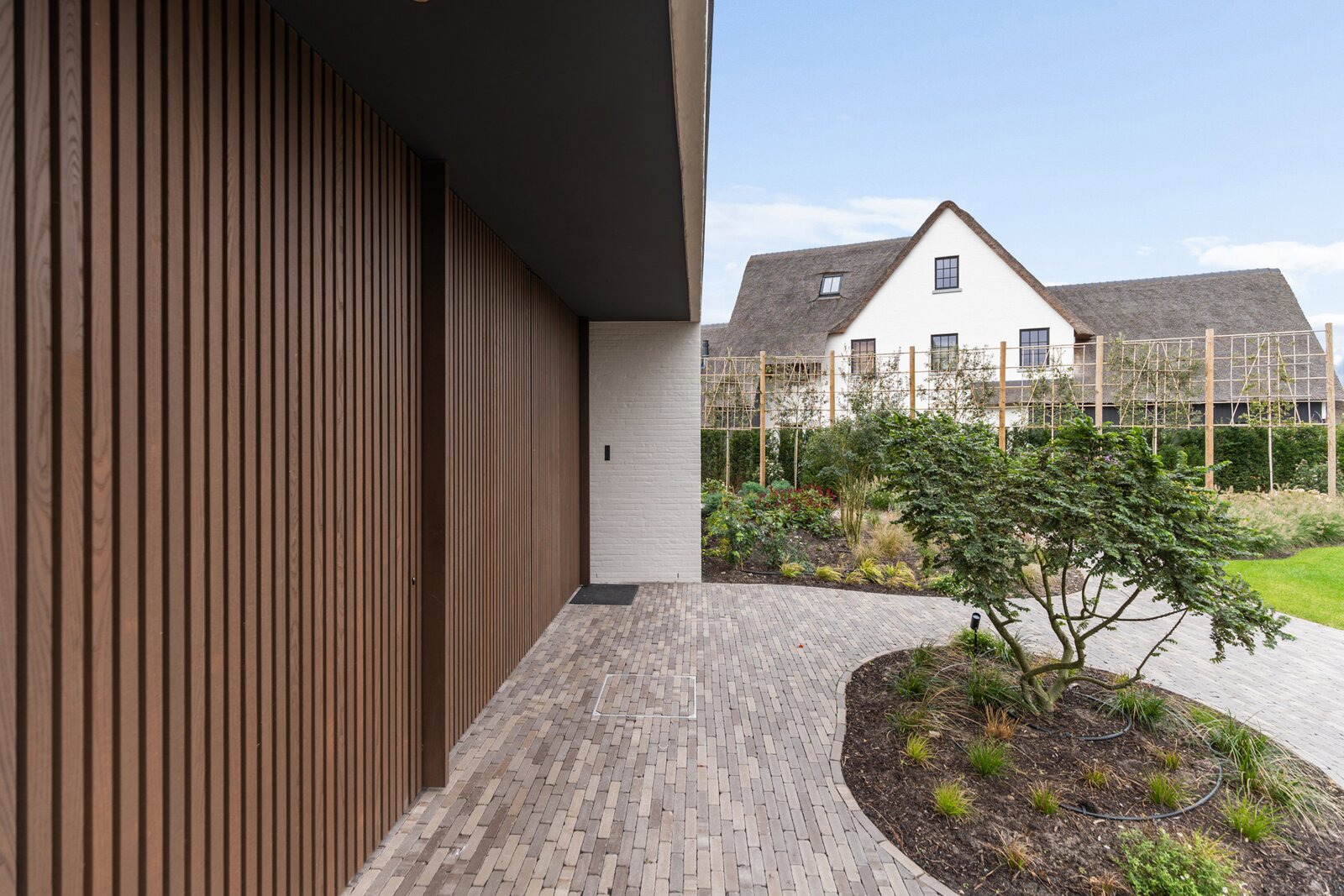Ondergronds beschikt de woning over een ruime garage met autolift voor meerdere wagens, een discrete fietsenberging en een hoogwaardig afgewerkte wijnkelder.
