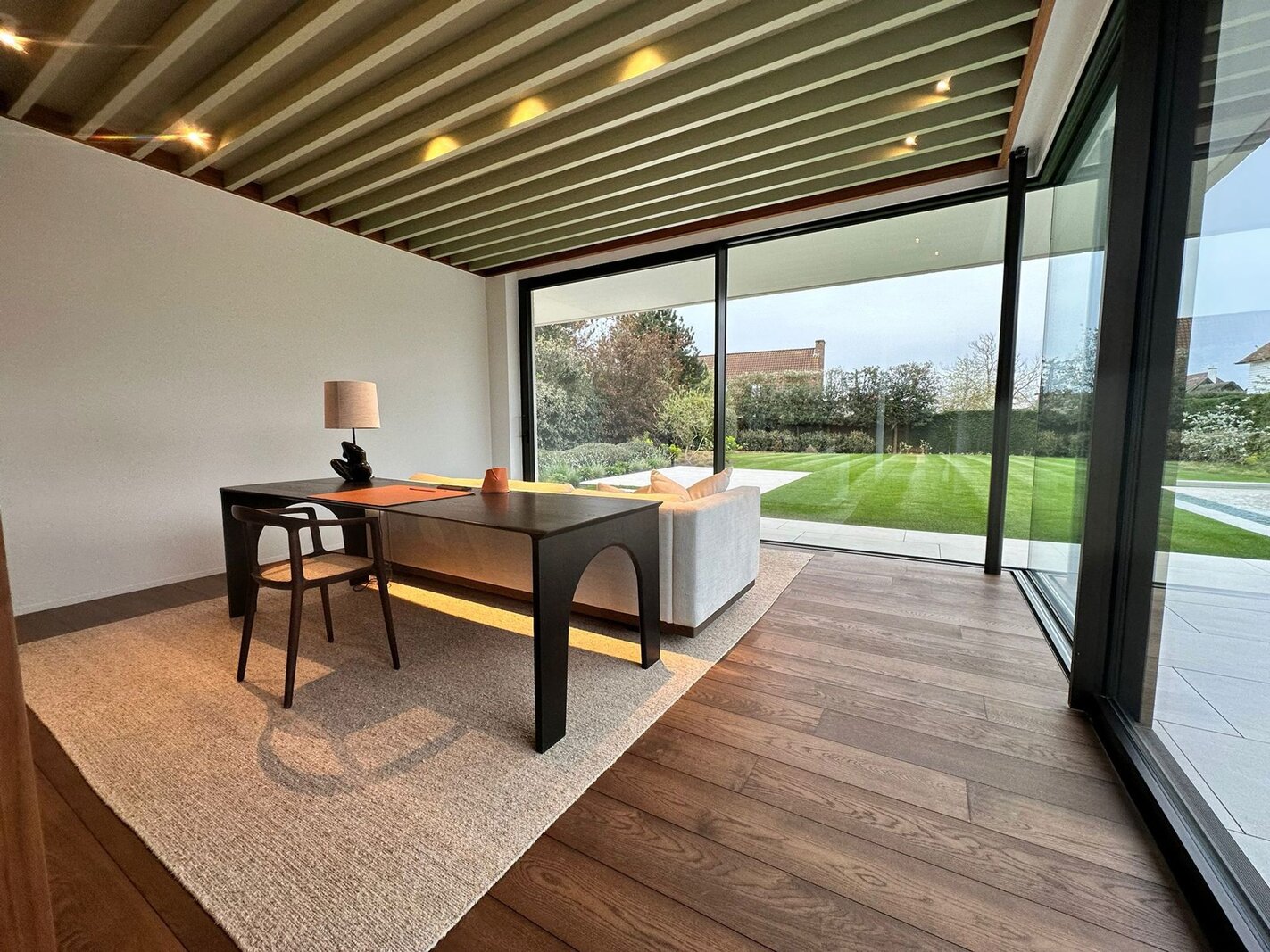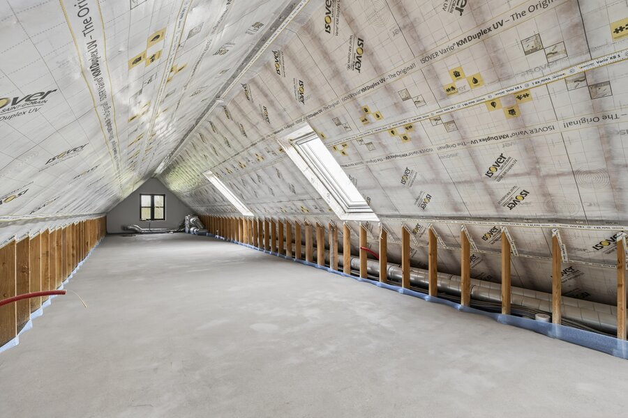 De tweede verdieping biedt een ruime polyvalente ruimte die vrij kan worden ingevuld als bureau, ontspanningsruimte of extra leefruimte.