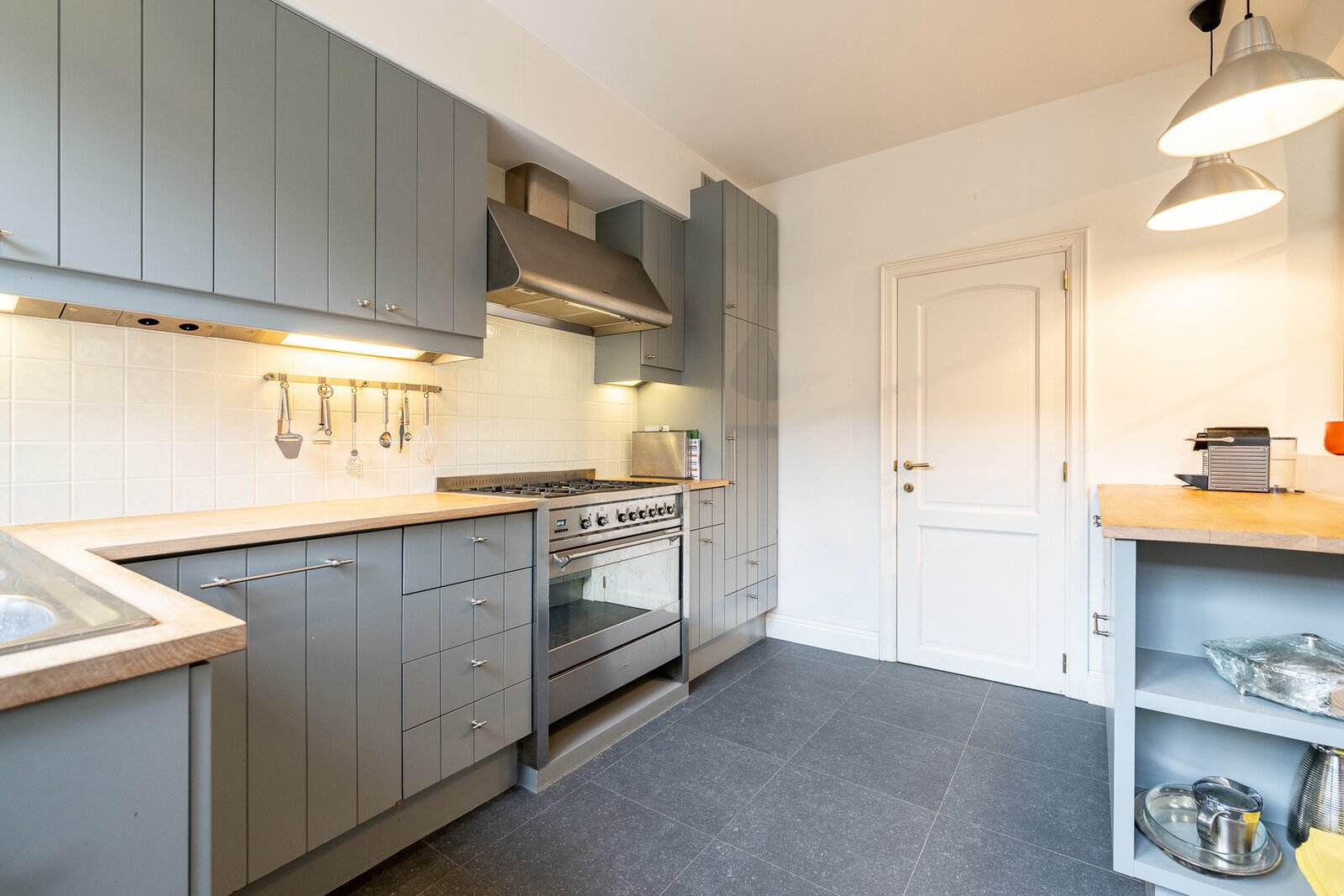 Een stijlvolle inkomhal met vestiaire en gastentoilet leidt naar de lichtrijke leefruimte met zit- en eethoek. De open, volledig ingerichte keuken met aansluitende berging kijkt uit op de gezellige tuin. Via de tuin bereikt u de garage, geschikt voor fietsen of wagen, met daarachter een extra staanplaats.