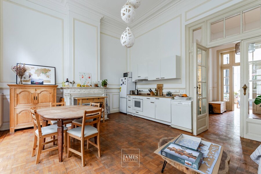 Met een mooie gevelbreedte combineert de woning royale volumes, veel lichtinval en potentieel. Enkele werken zijn reeds uitgevoerd, zoals de isolatie van de achtergevel, de gedeeltelijke vervanging van het schrijnwerk en de installatie van een hoogrendement gasketel. De appartementen dienen echter opgefrist te worden en de algemene indeling kan herzien worden afhankelijk van het project van de koper: terug naar eengezinswoning, behoud als opbrengsteigendom (onder voorbehoud van regularisatievergunning) of gerichte renovatie.