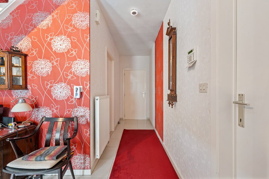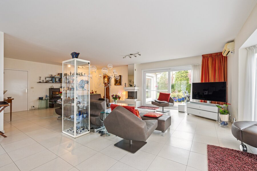 We betreden de woning via de centrale inkomhal met apart toilet en voldoende ruimte voor het plaatsen van een vestiairekast. Via deze ruimte heeft u toegang tot de woonkamer met gashaard die beschikt over grote raampartijen (met elektrische screens en zonneluifel) waardoor er zeer veel lichtinval aanwezig is. Keuken is volledig geïnstalleerd met combi oven, vaatwasmachine, natuurstenen werkblad, inductievuur, ijskast en vriesvak. De masterbedroom met eigen badkamer en dressing is voorzien op de gelijkvloerse verdieping zodat de woning ook ideaal geschikt is voor kopers op leeftijd, mindervaliden of co-housing.