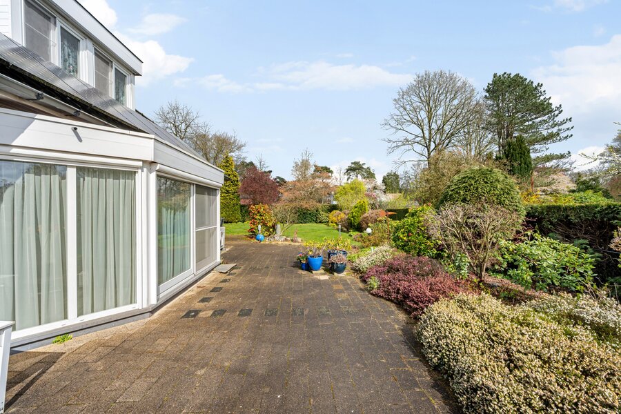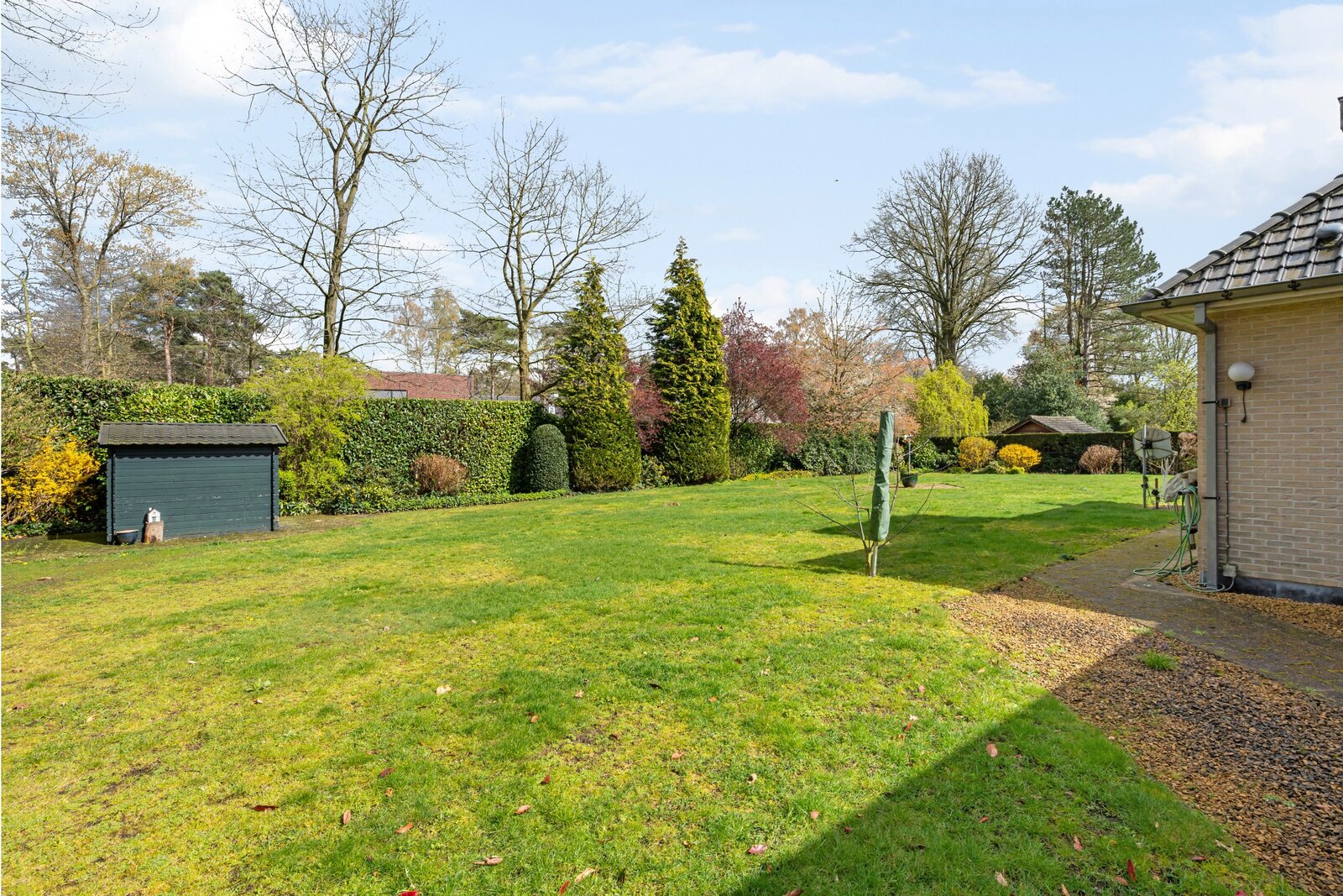 De tuin is fraai aangelegd en voorzien van een tuinhuis en robotmaaier.
