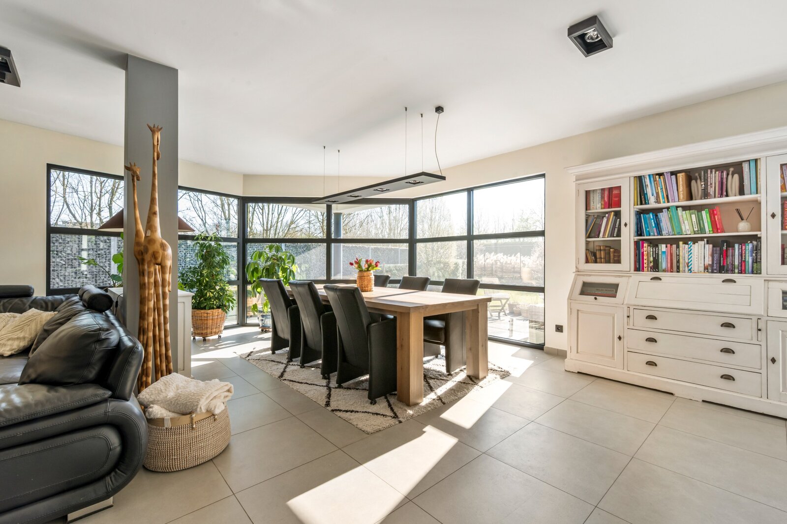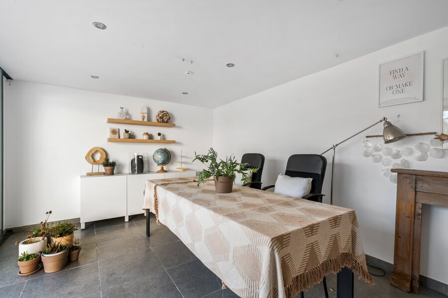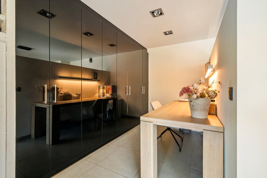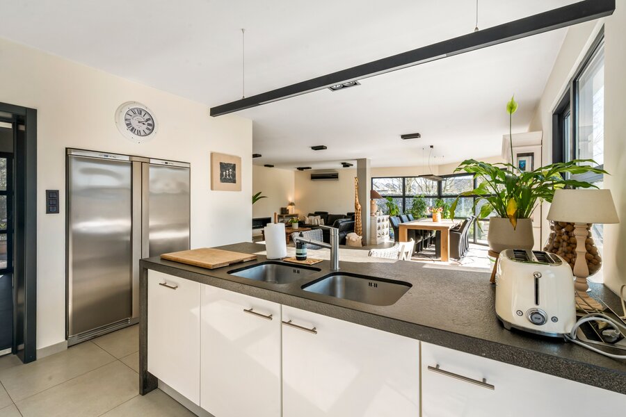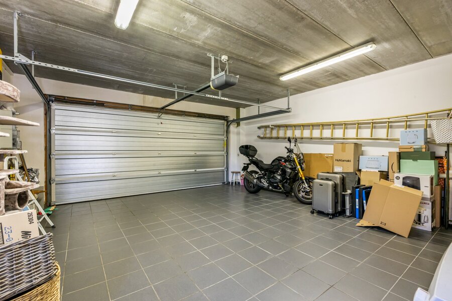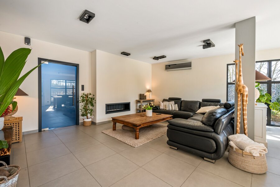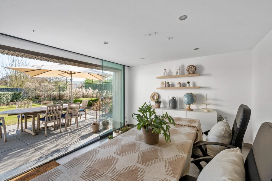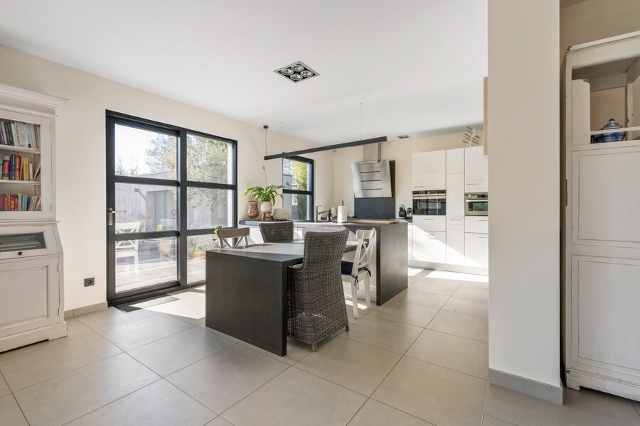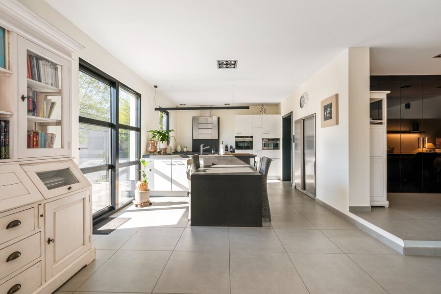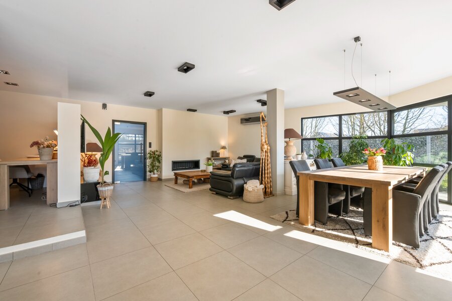 Bij het betreden van de woning wordt u verwelkomd in een lichtrijke leefruimte met gezellige gashaard, waar grote raampartijen zorgen voor een naadloze verbinding met het zonneterras en de prachtig aangelegde tuin. De open, witte maatkeuken met granieten werkblad en kookeiland met zittoog vormt het hart van de woning – perfect voor wie houdt van koken en samenzijn. Verder beschikt het gelijkvloers over een ruim bureel met maatkasten, een praktische wasplaats/berging, een koele berging en een dubbele inpandige garage met geautomatiseerde sectionaalpoort.