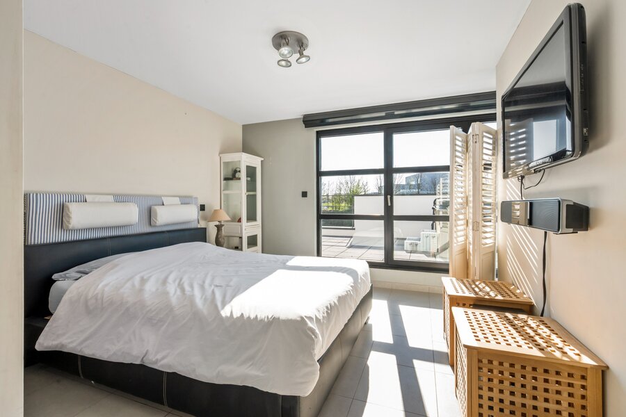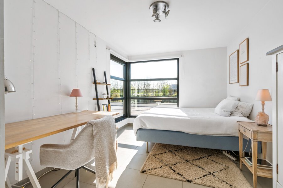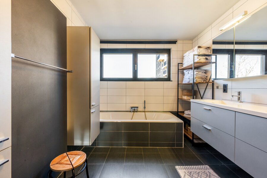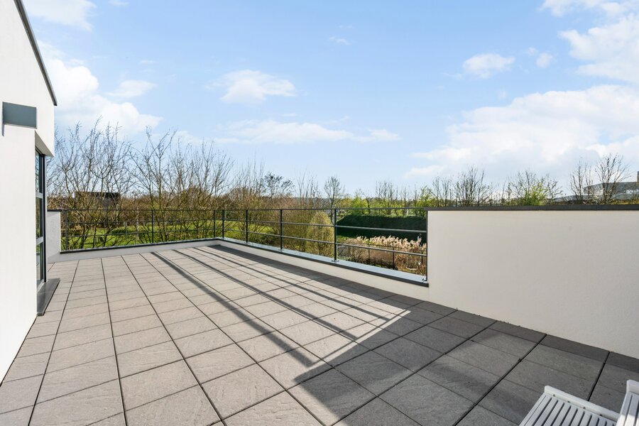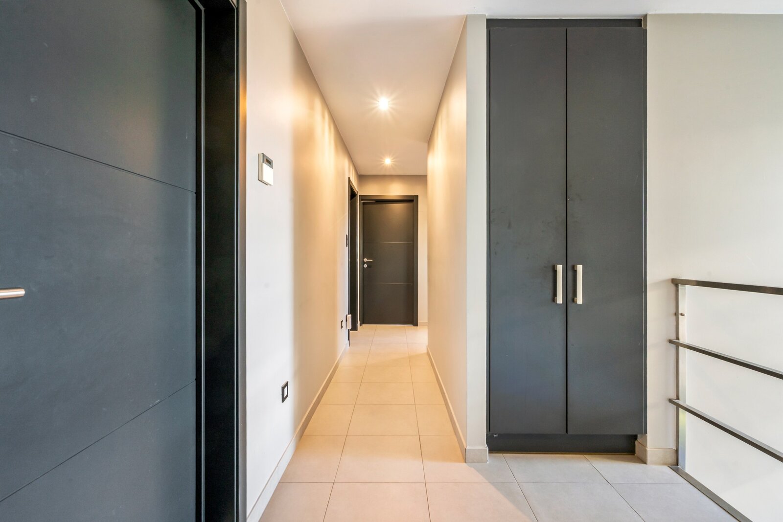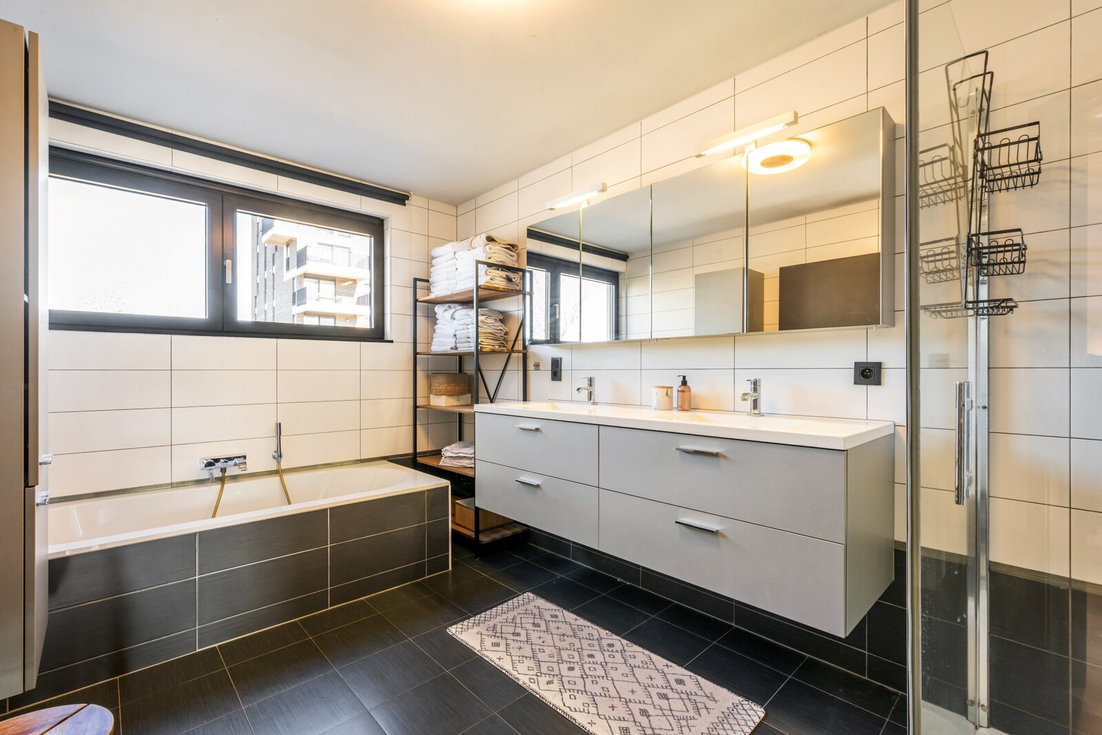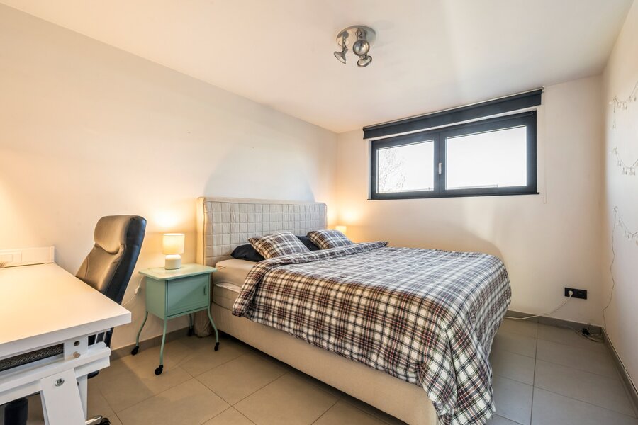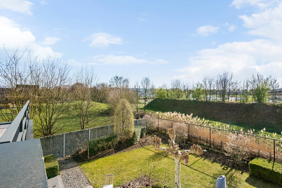 Op de verdieping bevinden zich drie volwaardige slaapkamers, waaronder een ruime master bedroom met dressing. De stijlvolle badkamer is volledig uitgerust met zowel bad als douche. Een extra troef is het terras met jacuzzi, toegankelijk vanuit de slaapkamers, waar u geniet van een prachtig uitzicht op de tuin.