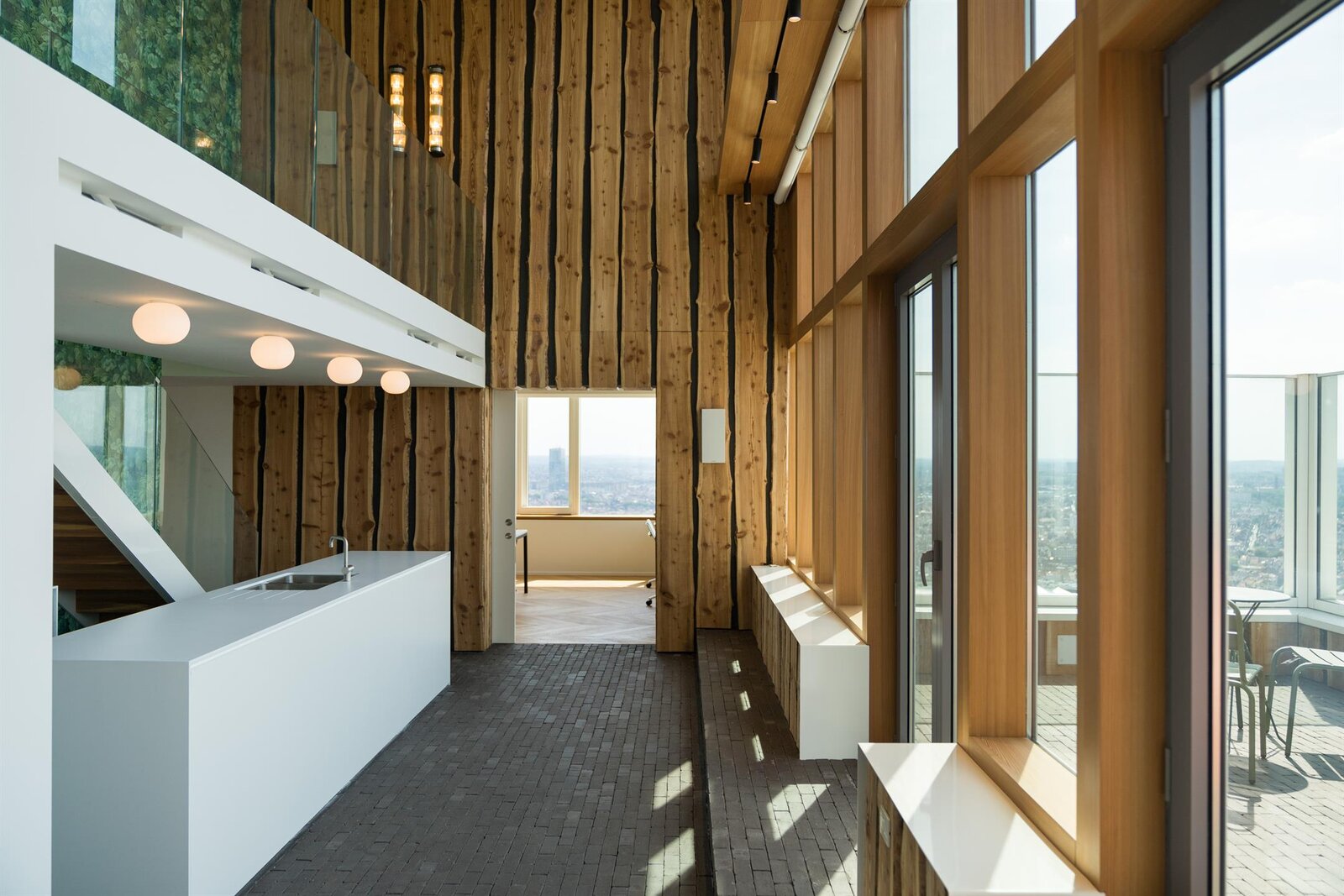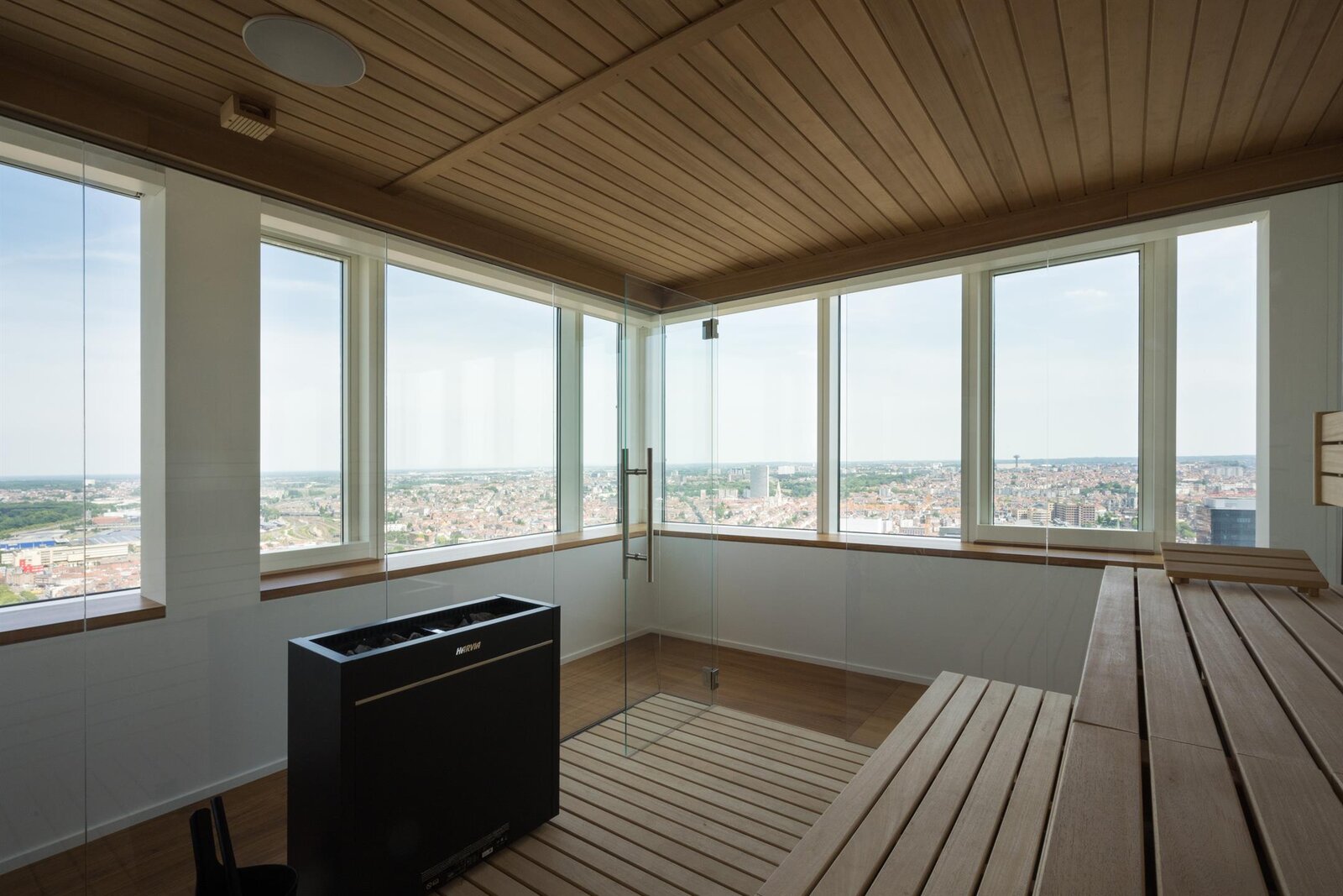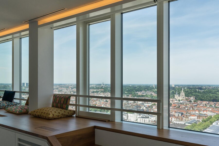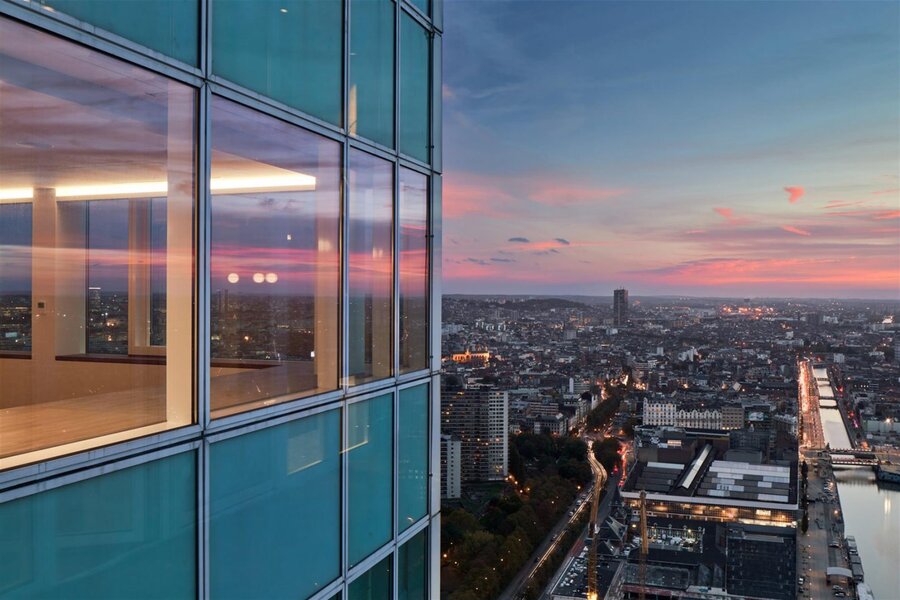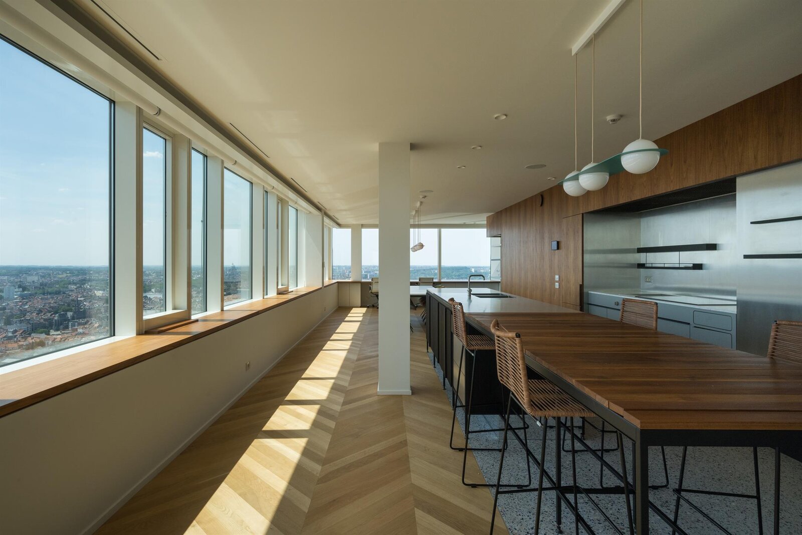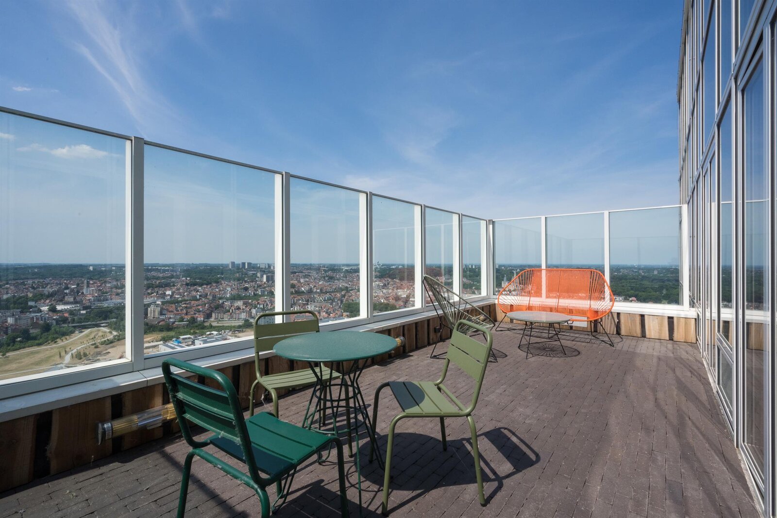 De “ hoogste PENTHOUSE van België” torent 140 meter hoog boven Brussel. Het appartement van 540m² bestaat uit een inkomhal met vestiaire met in het verlengde een wintertuin met bar die uitgeeft op een groot terras, een ruime leefruimte en een prachtige super uitgeruste Amerikaanse keuken. Het slaapgedeelte bestaat uit 3 suites met elk een slaapkamer met dressing en aangrenzende badkamer. Een grote ontvangstruimte, een panoramische sauna en een mezzanine vervolledigen dit luxueus appartement. 2 ondergrondse garageboxen, 2 parkeerplaatsen en kelders.