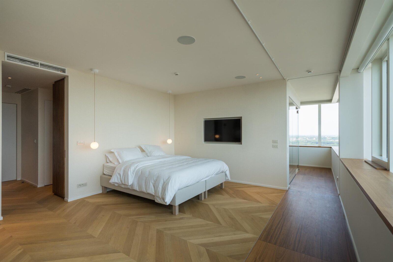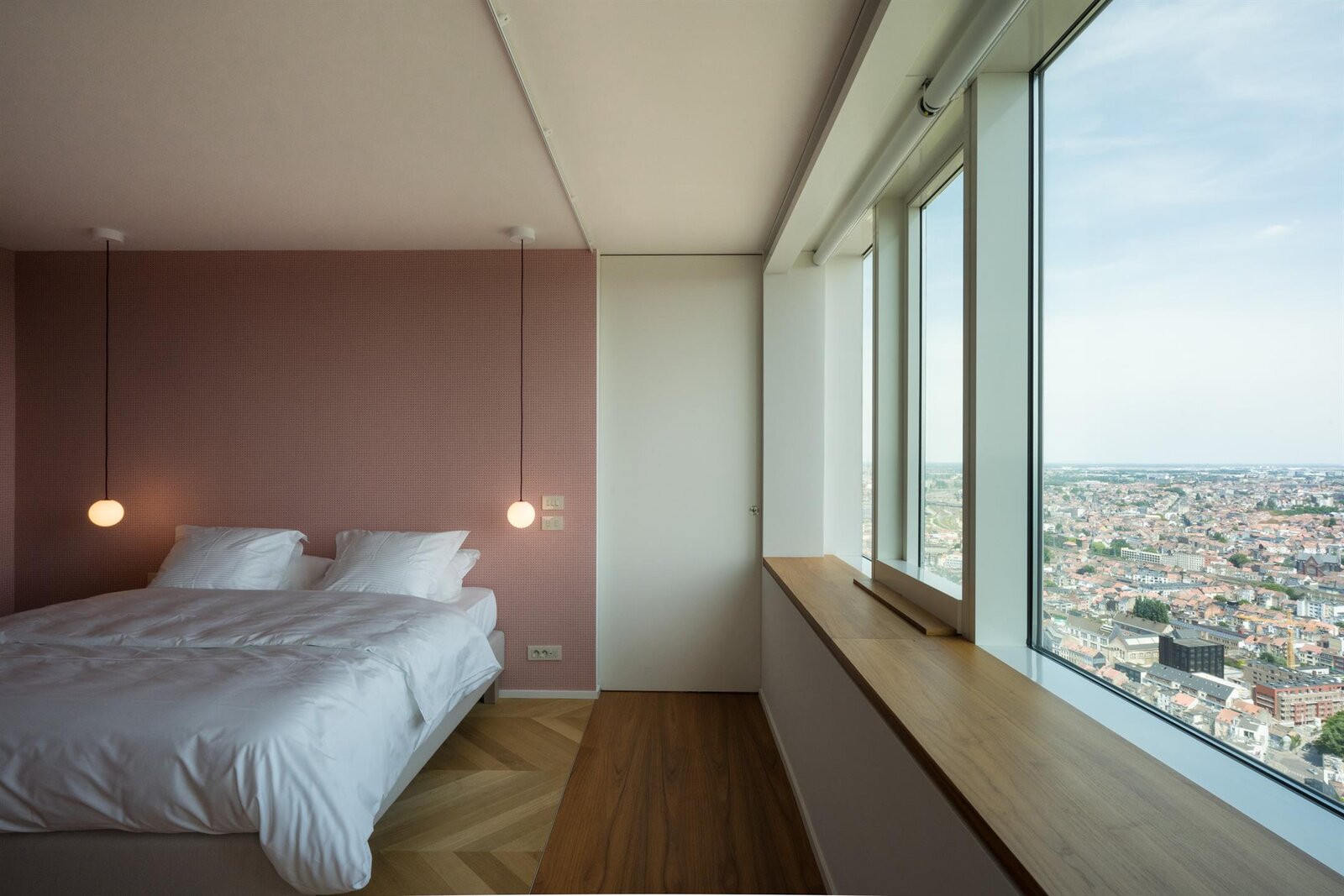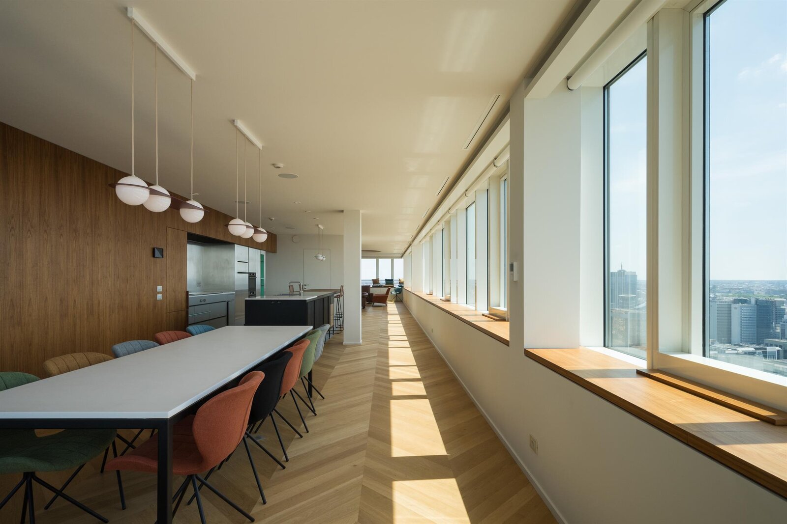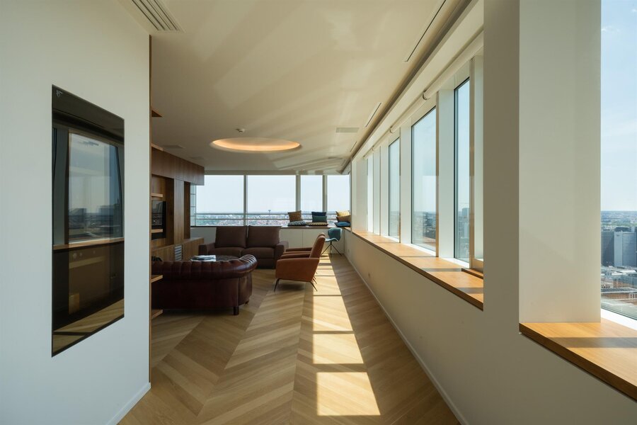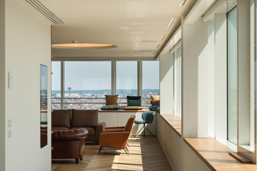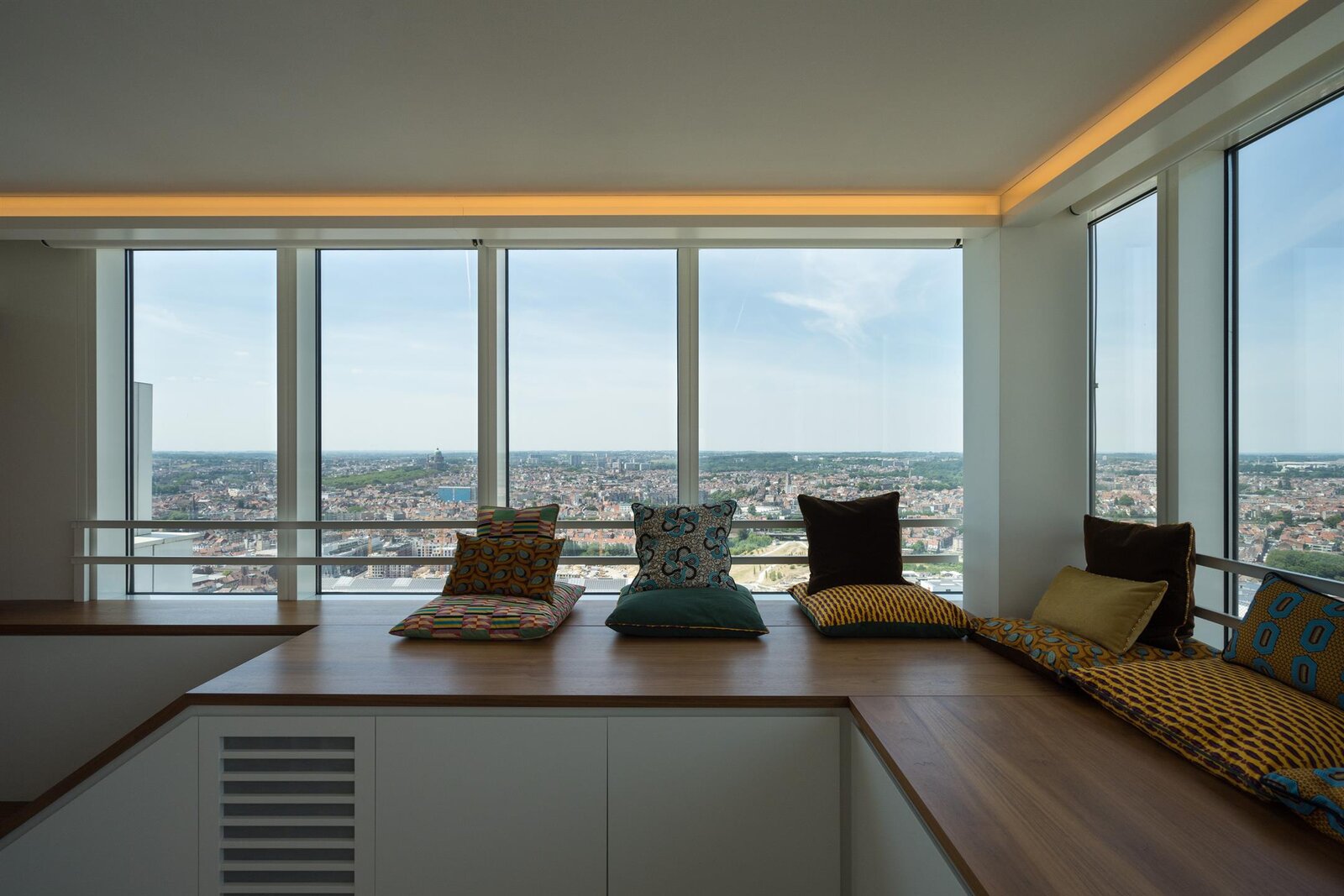 De “ hoogste PENTHOUSE van België” torent 140 meter hoog boven Brussel. Het appartement van 540m² bestaat uit een inkomhal met vestiaire met in het verlengde een wintertuin met bar die uitgeeft op een groot terras, een ruime leefruimte en een prachtige super uitgeruste Amerikaanse keuken. Het slaapgedeelte bestaat uit 3 suites met elk een slaapkamer met dressing en aangrenzende badkamer. Een grote ontvangstruimte, een panoramische sauna en een mezzanine vervolledigen dit luxueus appartement. 2 ondergrondse garageboxen, 2 parkeerplaatsen en kelders.