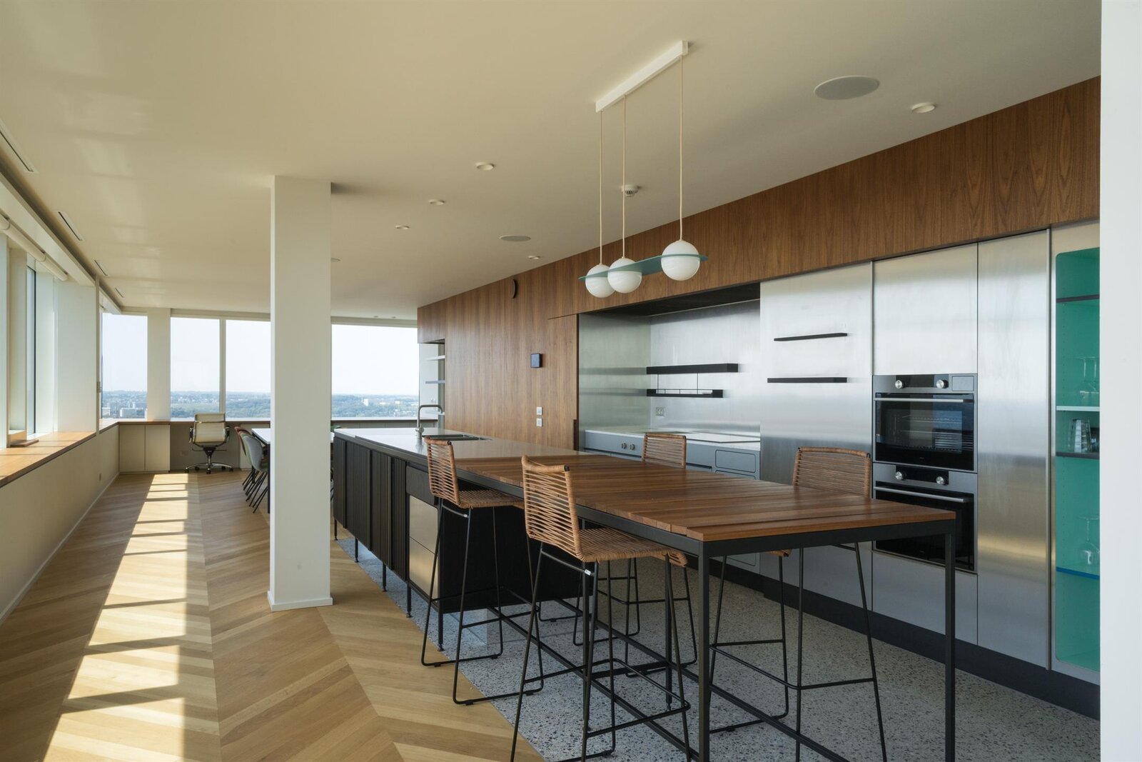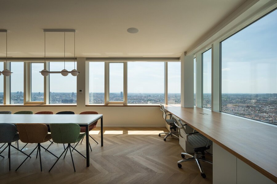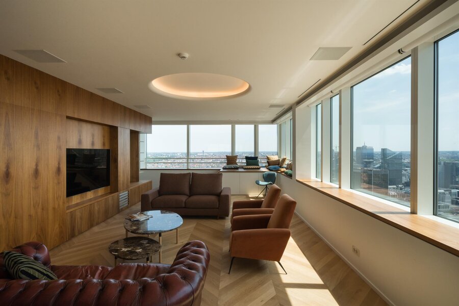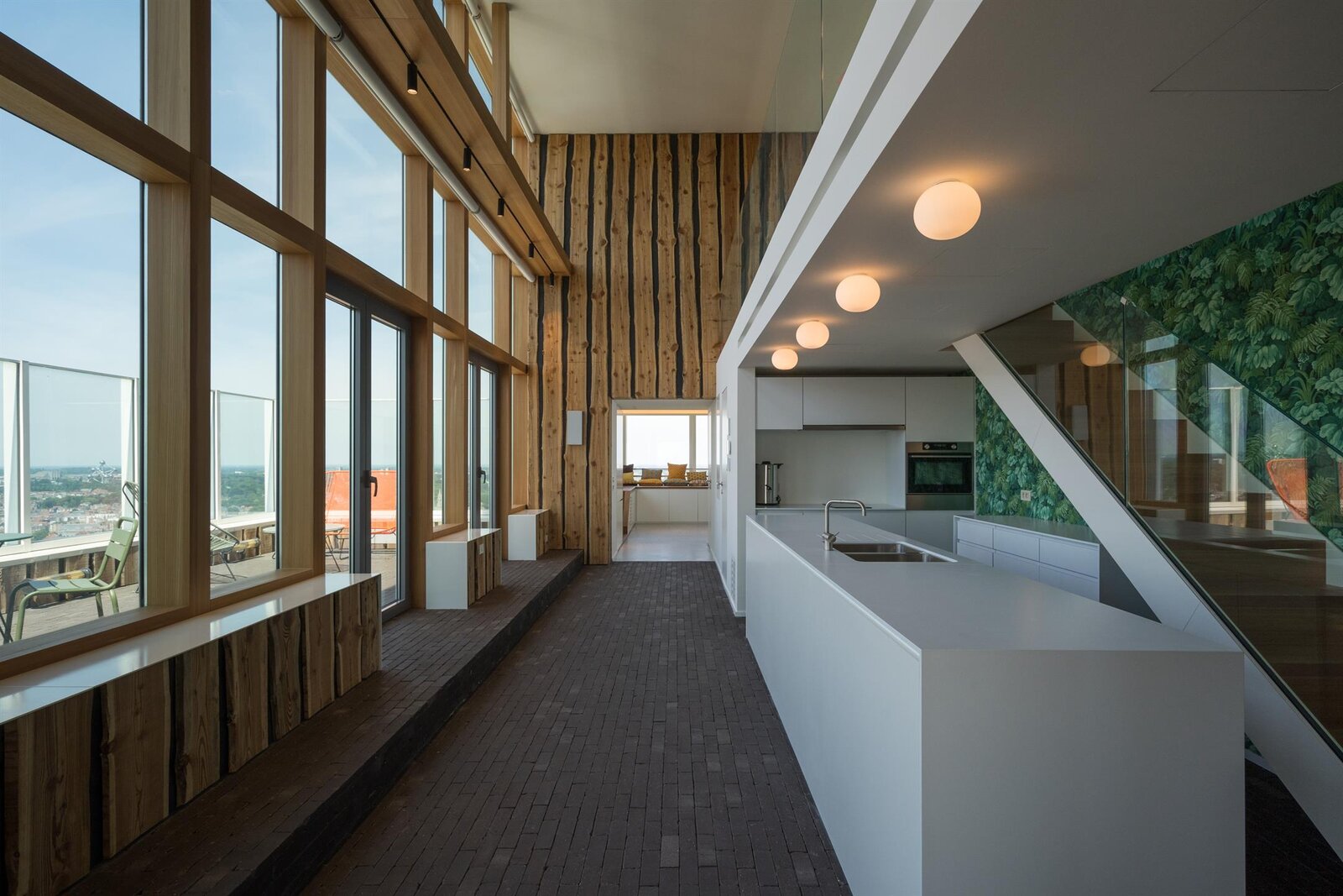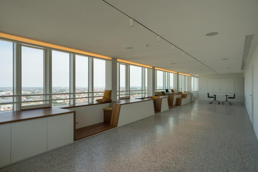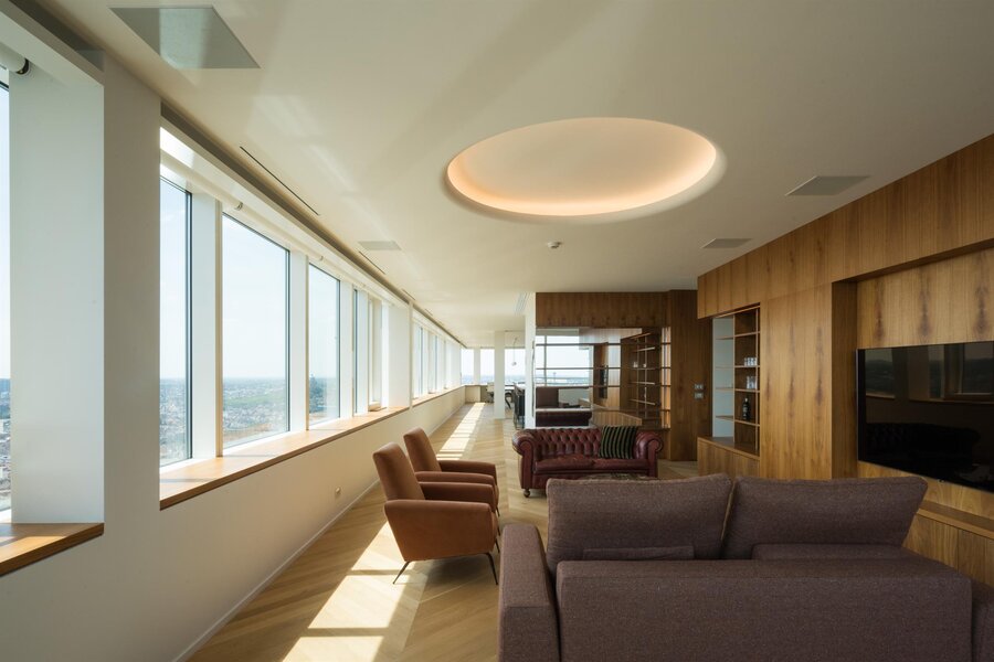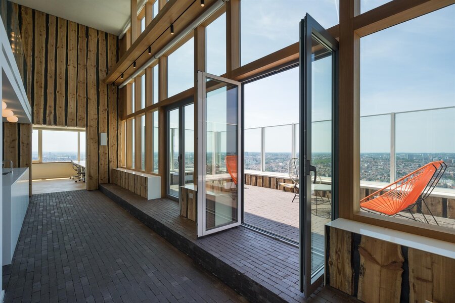 De “ hoogste PENTHOUSE van België” torent 140 meter hoog boven Brussel. Het appartement van 540m² bestaat uit een inkomhal met vestiaire met in het verlengde een wintertuin met bar die uitgeeft op een groot terras, een ruime leefruimte en een prachtige super uitgeruste Amerikaanse keuken. Het slaapgedeelte bestaat uit 3 suites met elk een slaapkamer met dressing en aangrenzende badkamer. Een grote ontvangstruimte, een panoramische sauna en een mezzanine vervolledigen dit luxueus appartement. 2 ondergrondse garageboxen, 2 parkeerplaatsen en kelders.