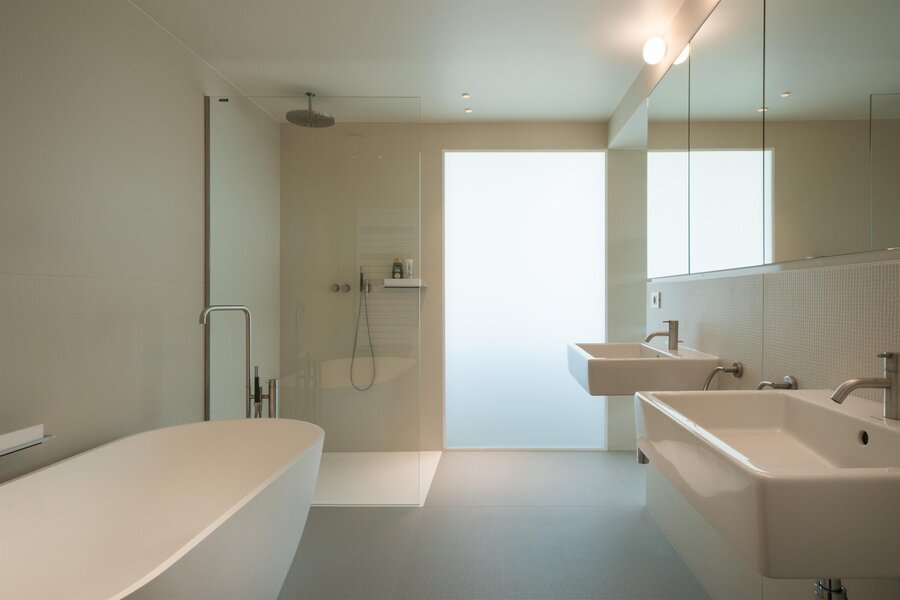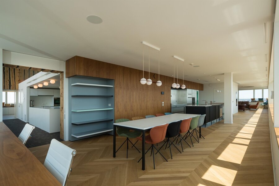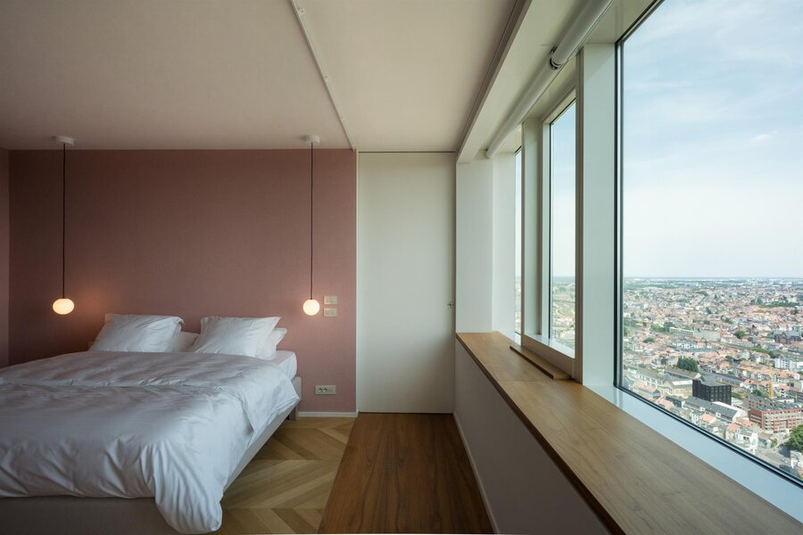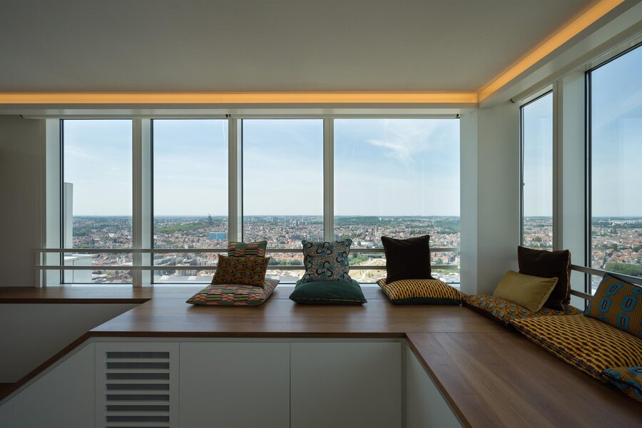 Het project maak maximaal gebruik van het uitzonderlijk 360° zicht over de 540m² door middel van een “ promenade” over alle gevels over een perifere gang in notelaar: venstertabletten, banken aan de ramen, parket. Overdag scheiden pocketdeuren de slaapkamers van de gevels teneinde dit parkoers niet te onderbreken.