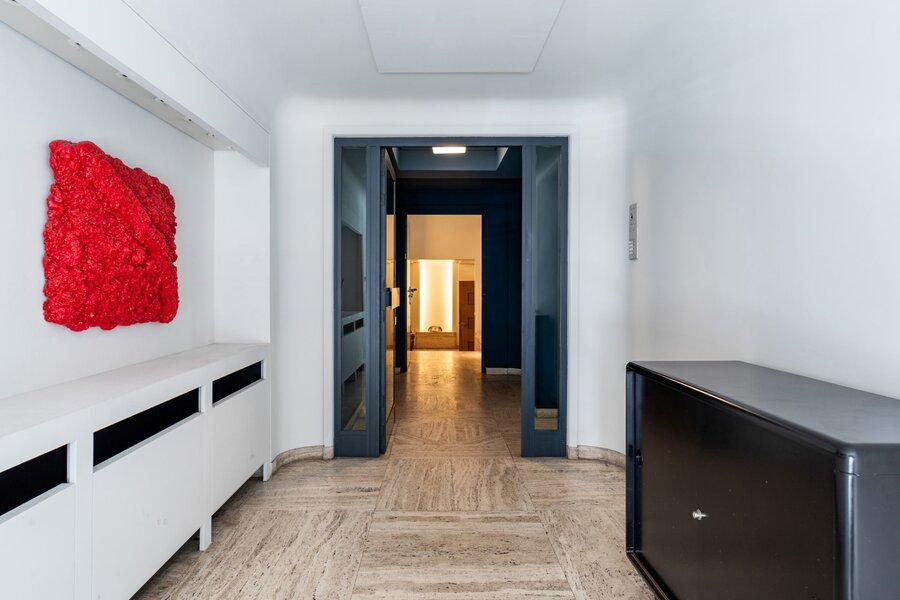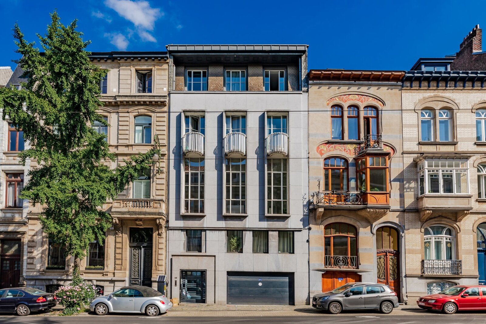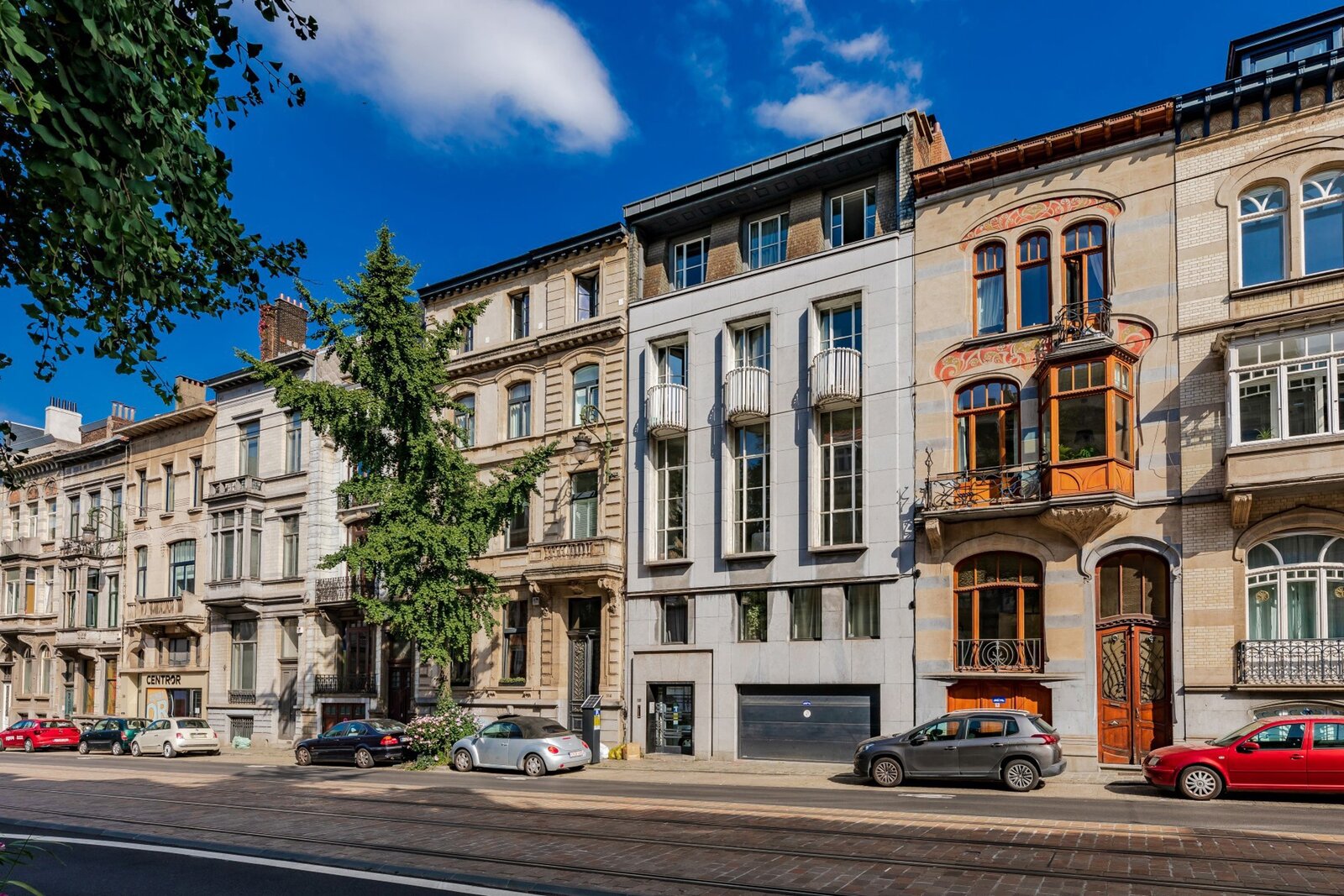 Aan de voorgevel, een vastgoedbelegging met 3 appartementen waarvan 1 duplex +/- 170 m² (EPC C-), 1 appartement +/- 85 m² (EPC C-) en 1 penthouse +/- 114 m² (EPC G). 2 garages, lift.