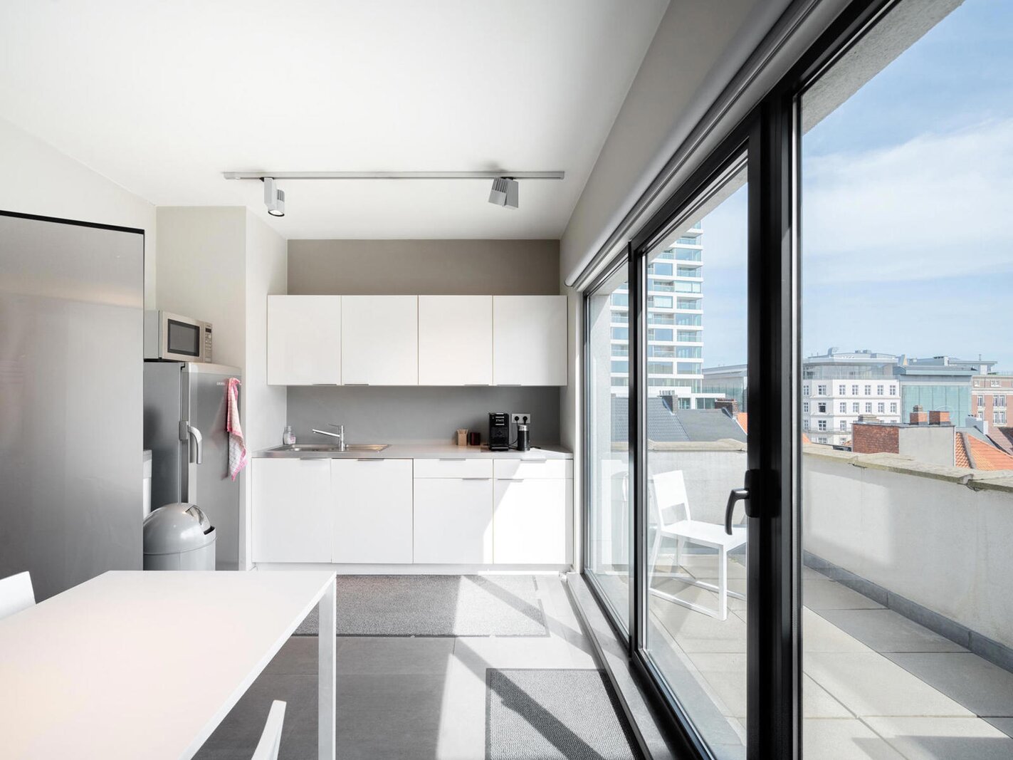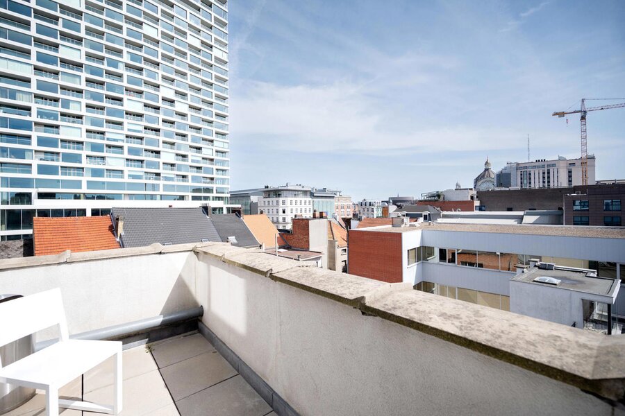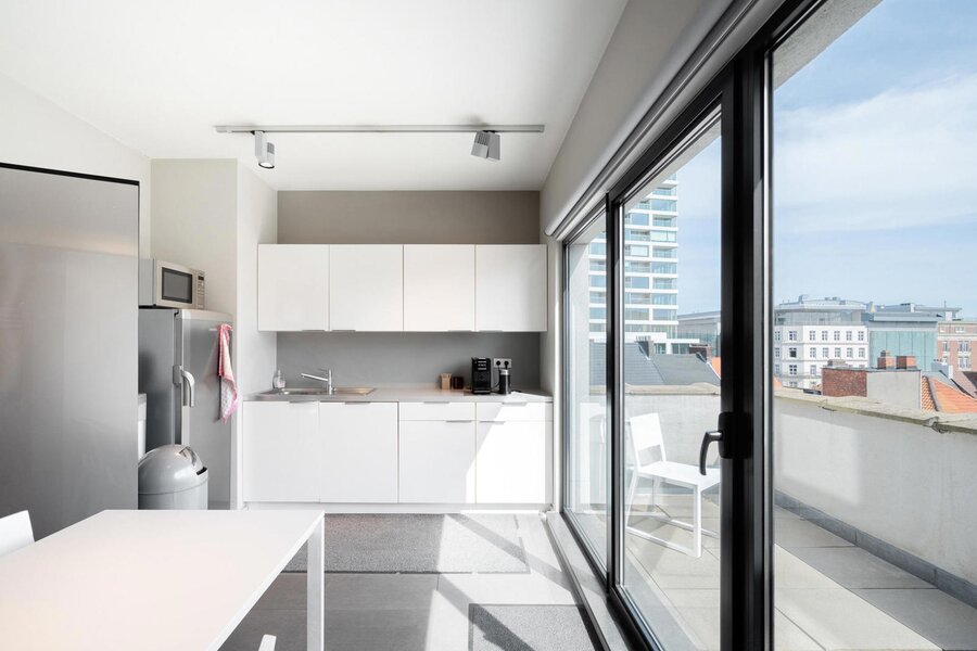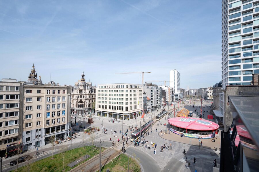 Eén van de grootste troeven van het appartement is zonder twijfel de ligging. Met de verschillende winkelstraten, culturele trekpleisters en het openbaar vervoer in de buurt, zal u, u zeker geen moment vervelen. Een wandeling op zondag naar de Vogelenmarkt, een voorstelling in “het Elckerlyk Theater” of shoppen op de Meir? Dit allemaal op wandelafstand. Door de nabijheid van het centraal station, springt u eveneens in “no time” de trein op. Ook op de terrassen geniet u van de fantastische ligging, daar valt u meteen in een zwijm voor het uitzicht over de hele stad.