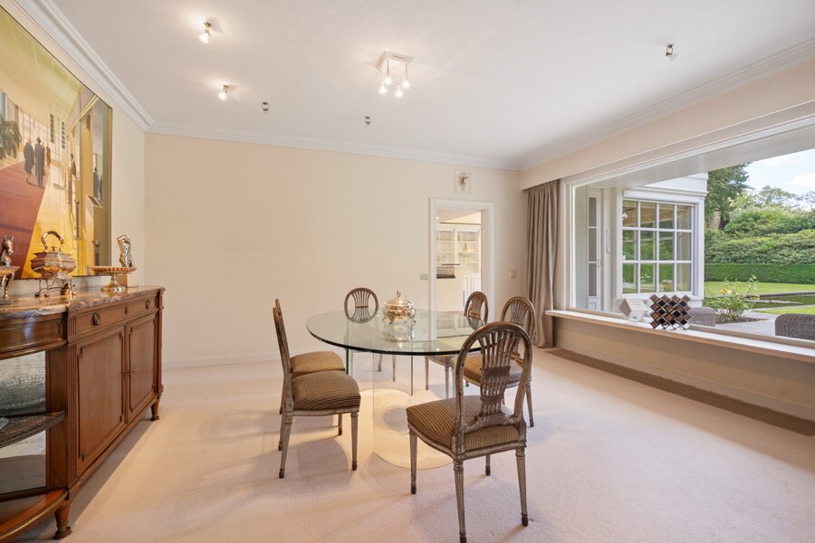 Inkomhal met ruime ingebouwde vestiaire en gastentoilet. Lichtrijke living uitgevend op terras en zonovergoten zuidgerichte tuin met charmante vijver. Apart TV-salon met bibliotheek en leeshoek. Ruime eetkamer. Volledig ingerichte keuken met aparte lichtrijke ontbijtruimte. Dubbele garage met wasplaats, douche en kitchenette. Personenlift aanwezig van niveau 0 tot +1. Buitenparking met plaats voor meerdere wagens.