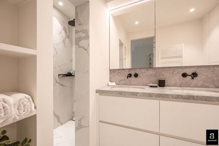 Inkomhal met gastentoilet, zonnige woonkamer met zijdelings zeezicht en een open, volledig uitgeruste keuken. Twee ruime slaapkamers geschikt voor een dubbel bed en een derde slaapkamer voorzien van twee enkele bedden. Moderne badkamer met dubbele wastafel en inloopdouche. Achteraan bevindt zich een terras.