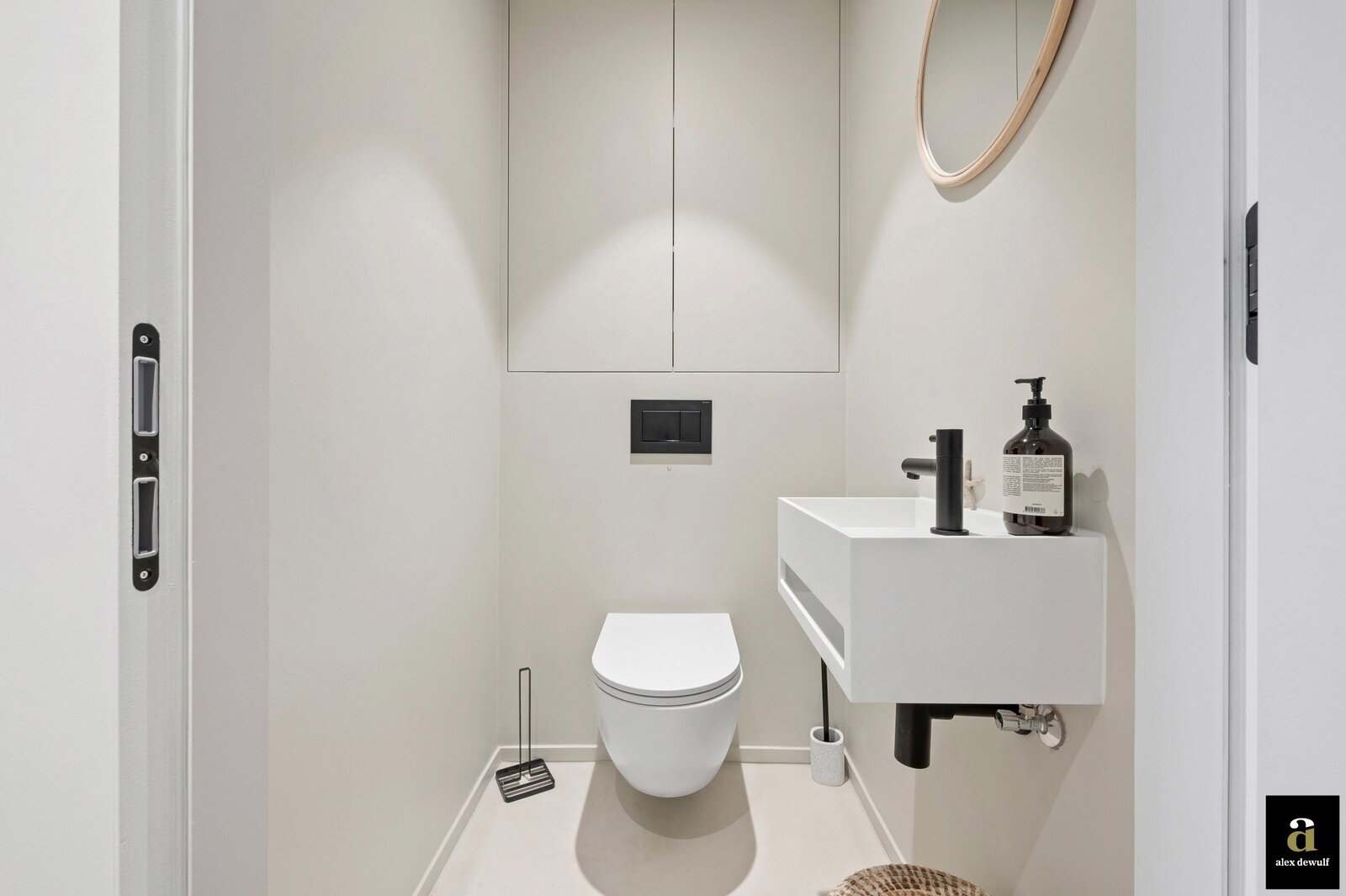 Indeling: inkomhal met vestiaire, gastentoilet, praktische berging met aansluiting wasmachine en droogkast, moderne open keuken met kookeiland en voorzien van alle comfort (fineer eiken houten kasten met veel opbergruimte, wijnfrigo, quooker kraan, Miele ovens).