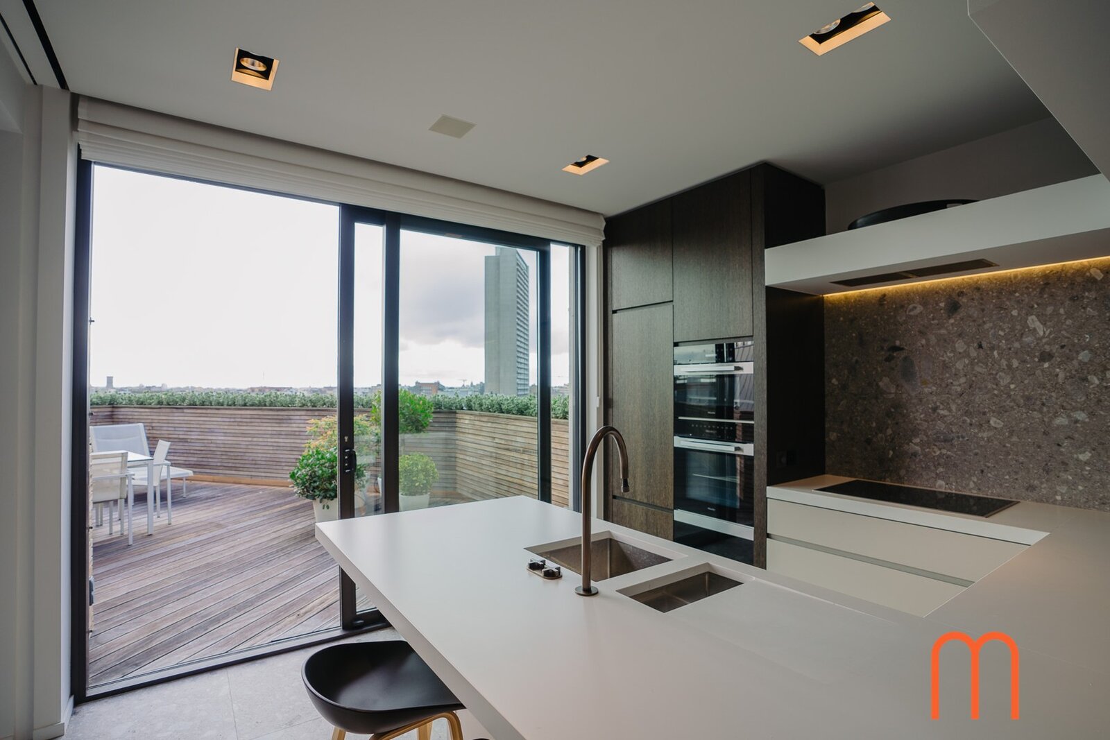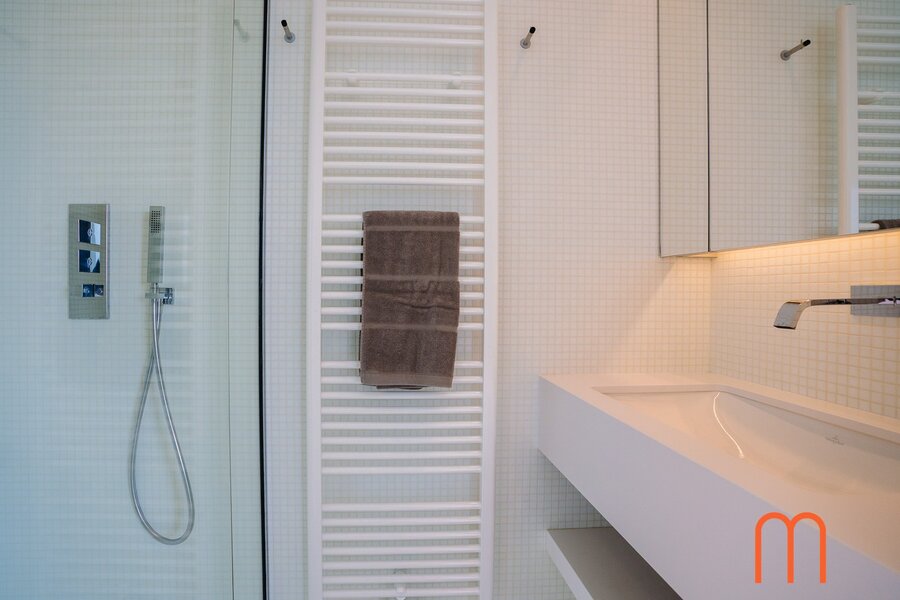 Het volledige appartement is afgewerkt met op maat gemaakte kasten en luxe maatwerk van Obumex. De penthouse is uitgerust met een B&O-geluidsinstallatie, domotica, een alarminstallatie en airconditioning voor optimaal comfort.