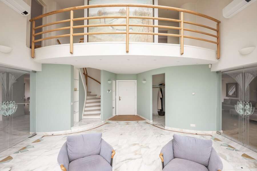 Via vaste trap komen we op de verdieping op parket met overloop die uitgeeft op de inkomhal en eveneens de grote raampartijen.