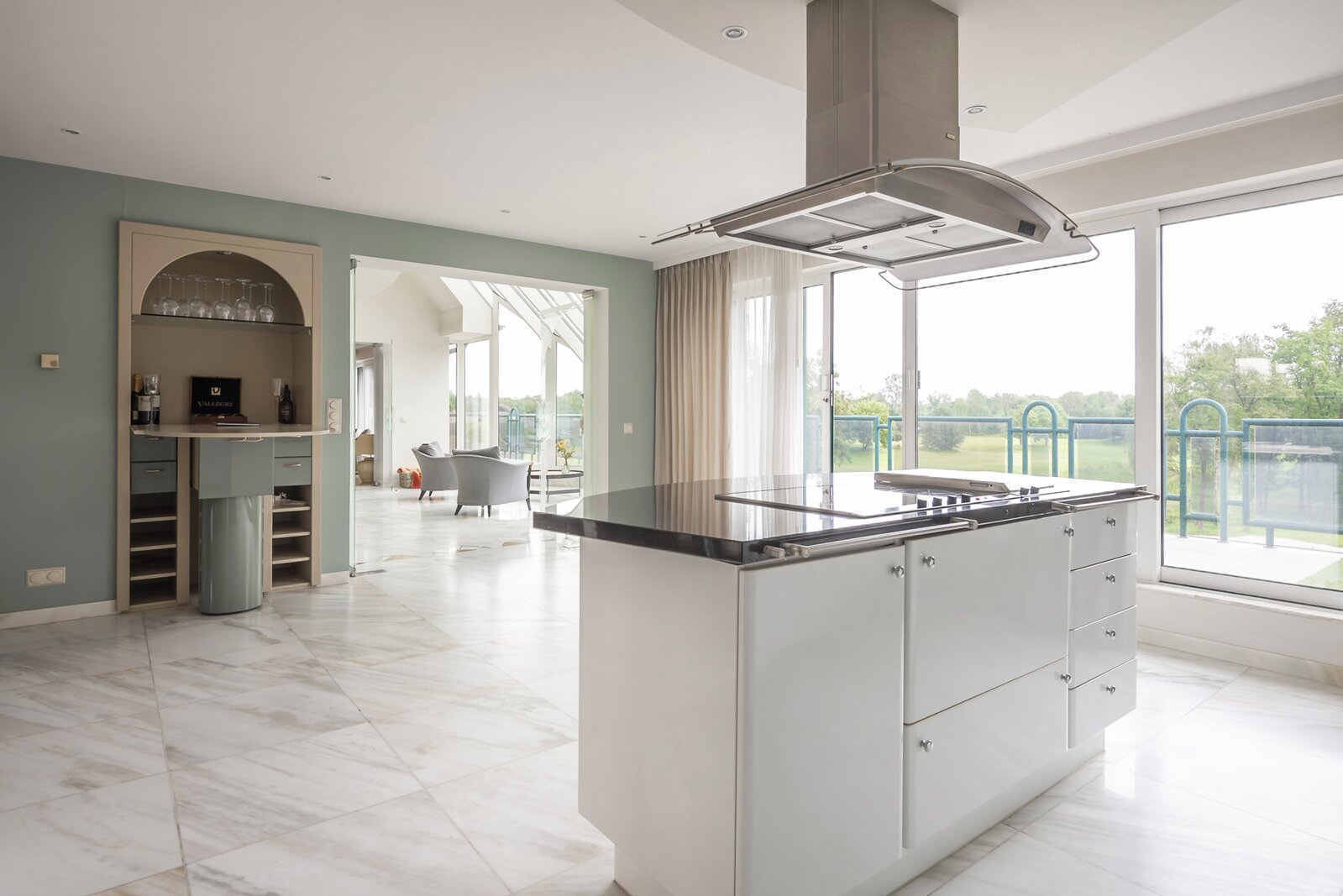 Volledig ingerichte eetkeuken met tal van ingemaakte kasten met hoogwaardige materialen afgewerkt. Aansluitend nog ruime berging/bijkeuken.