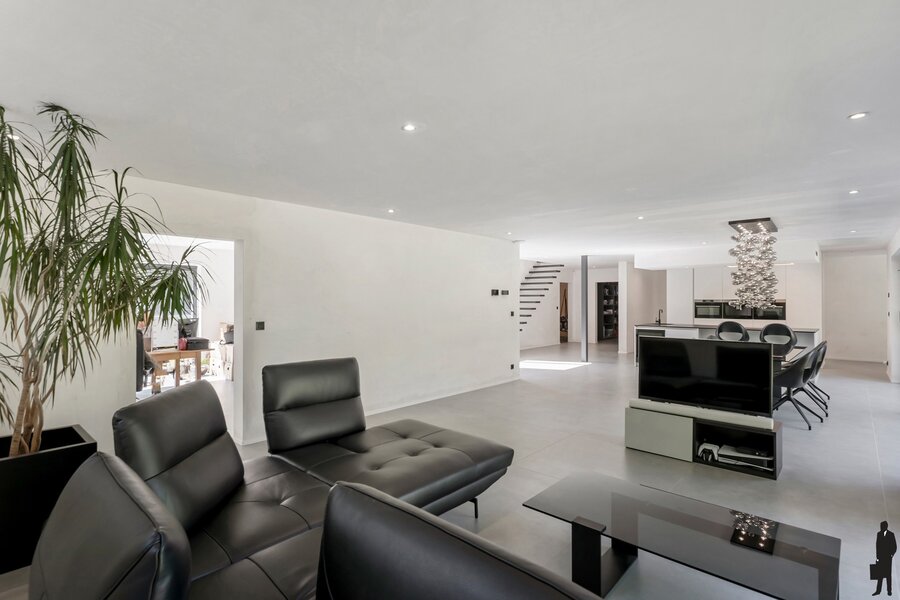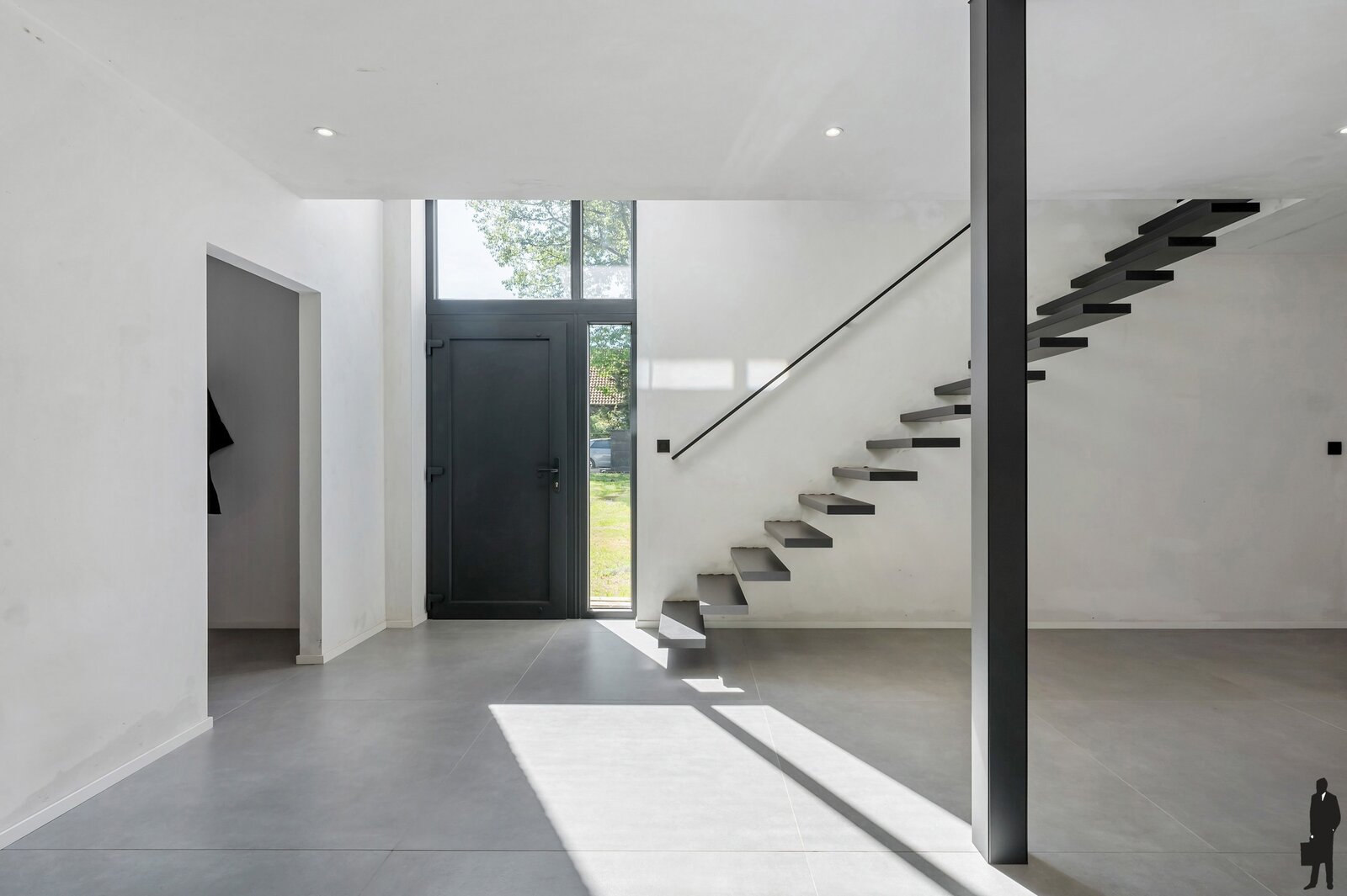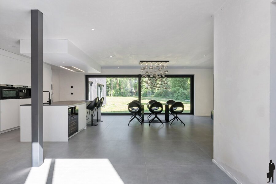 De grote raampartijen over de volledige hoogte zorgen voor maximale lichtinval en een directe connectie met de tuin