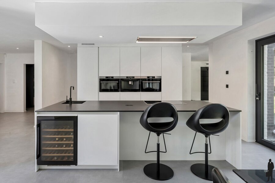 Hyper-geïnstalleerde open keuken met groot eiland, wijnkoeler, inductiekookplaat, ingebouwde koffiemachine, ovens, koelkast en vaatwasser