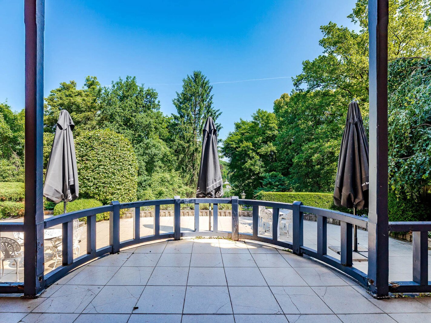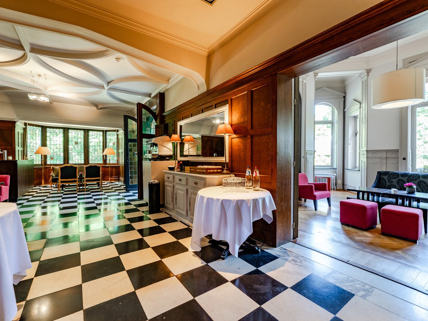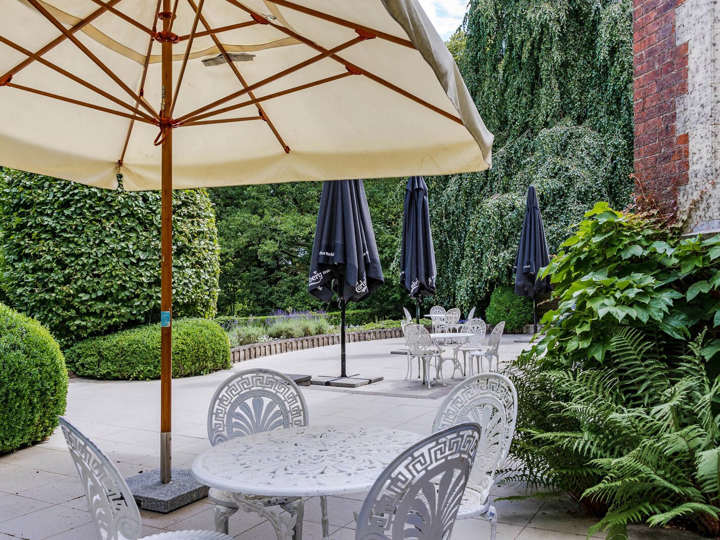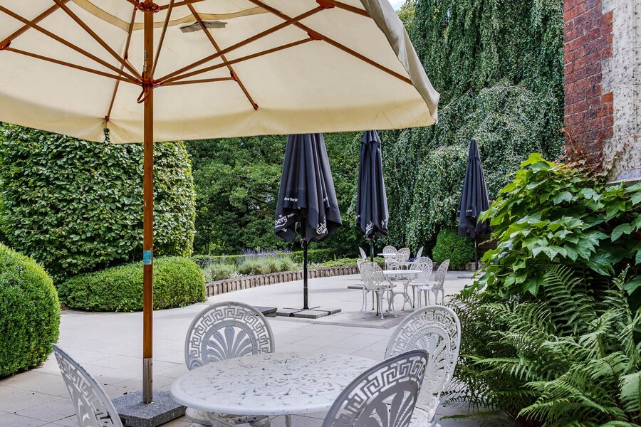 Aan de voorkant ligt een grote receptietuin; aan de achterkant biedt een groot terras een panoramisch uitzicht over het meer. Het interieur bestaat uit aantrekkelijke ontvangstruimten, een restaurant, een professioneel uitgeruste keuken en een pantry.