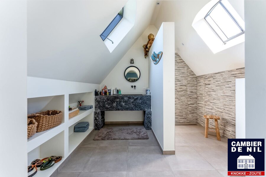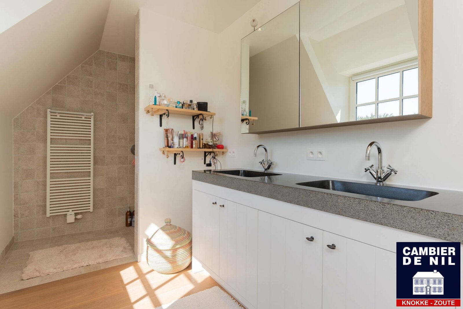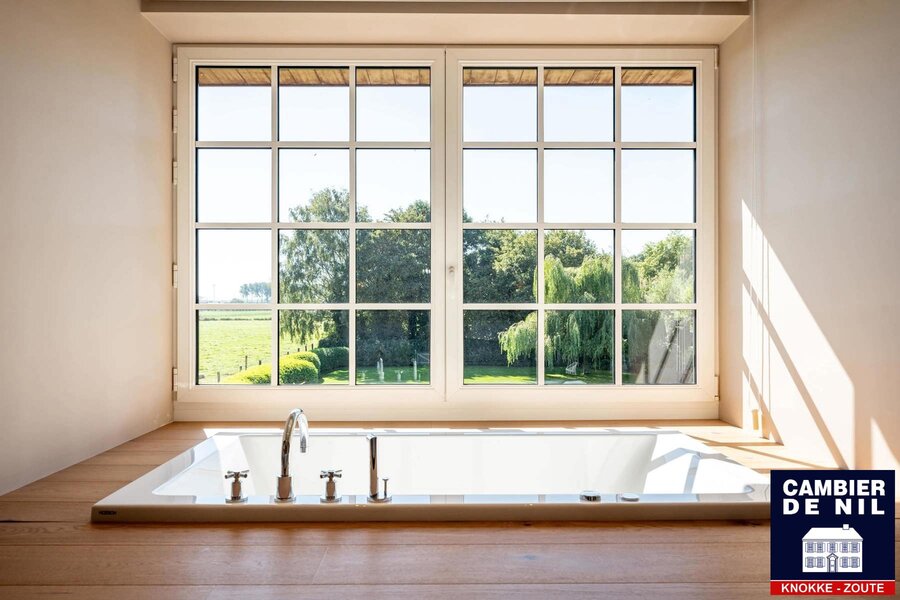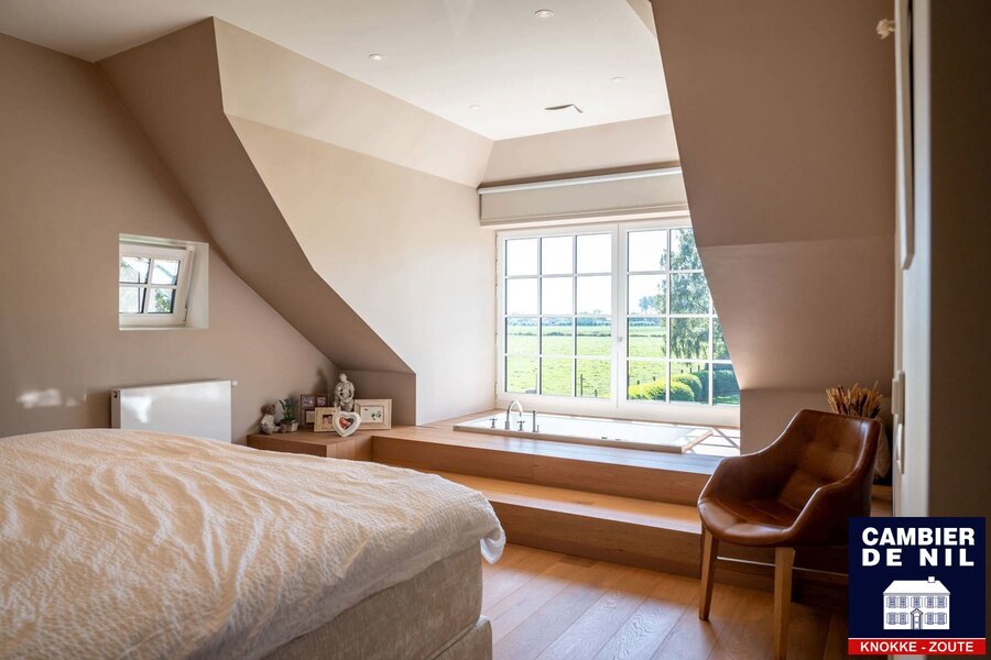 Op de eerste verdieping: De masterbedroom met ensuite badkamer (ligbad, inloopdouche, dubbele lavabo en toilet) geeft uit op het ruim terras met open zichten. De tweede slaapkamer is voorzien van ingemaakte kasten en een badkamer met ligbad, inloopdouche, dubbele lavabo en toilet. Aanpalend is er een terras met uitzicht op de velden. De derde slaapkamer is uitgerust met een douchekamer (inloopdouche, lavabo en toilet).
