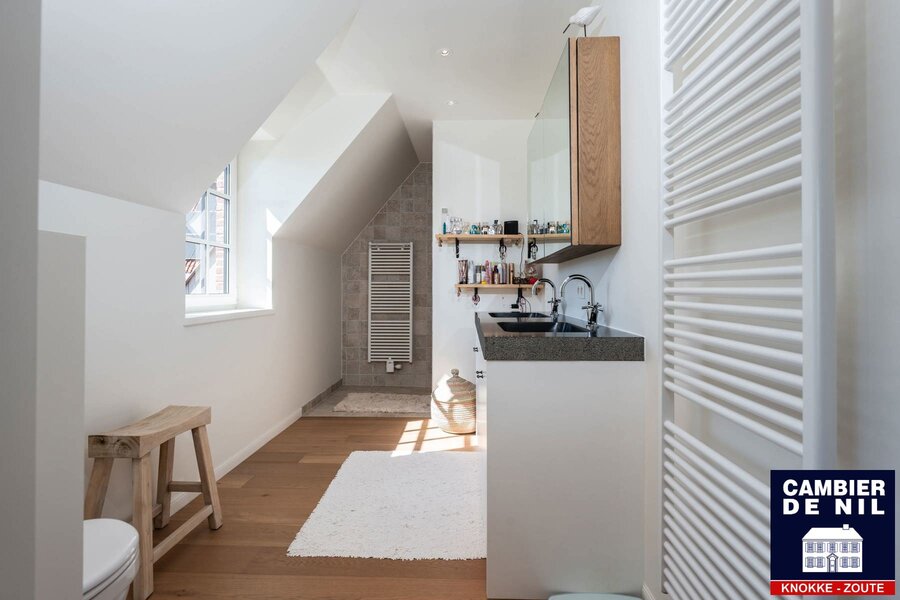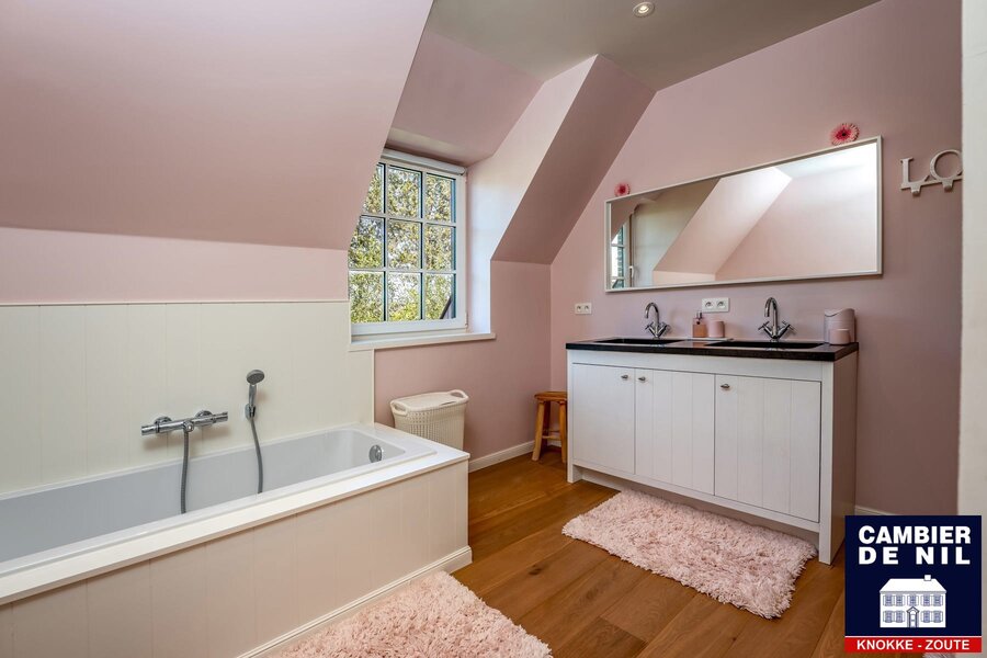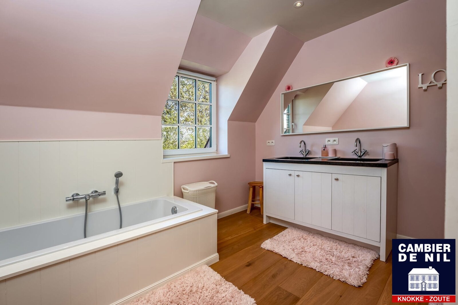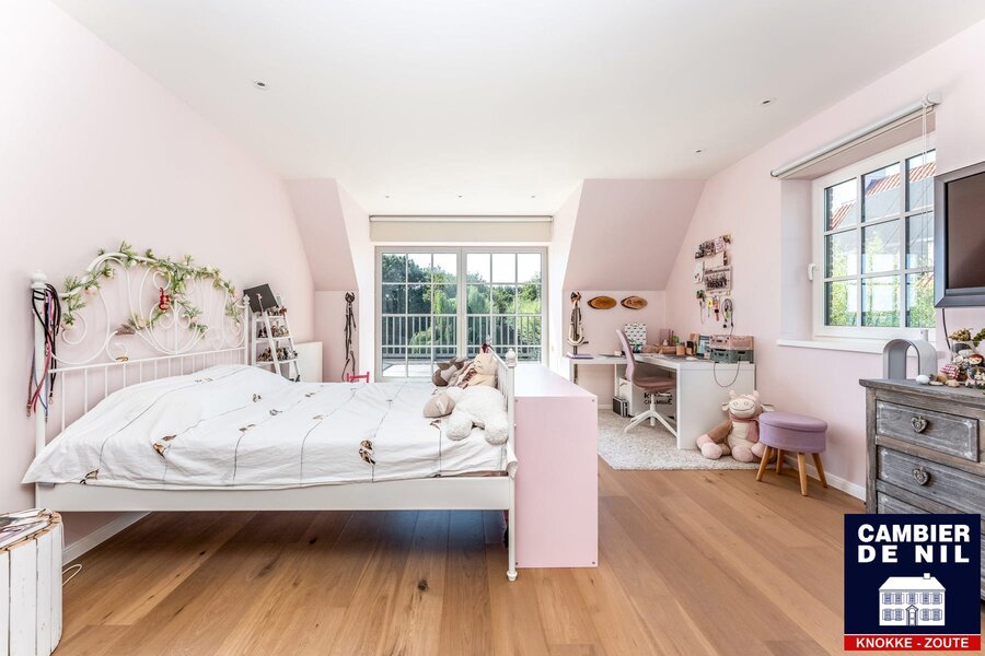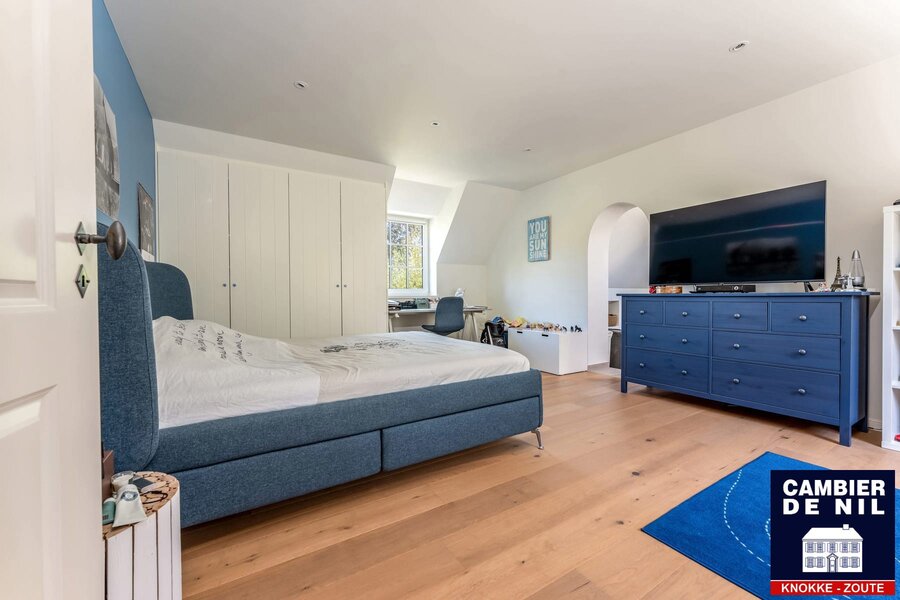 Op de eerste verdieping: De masterbedroom met ensuite badkamer (ligbad, inloopdouche, dubbele lavabo en toilet) geeft uit op het ruim terras met open zichten. De tweede slaapkamer is voorzien van ingemaakte kasten en een badkamer met ligbad, inloopdouche, dubbele lavabo en toilet. Aanpalend is er een terras met uitzicht op de velden. De derde slaapkamer is uitgerust met een douchekamer (inloopdouche, lavabo en toilet).