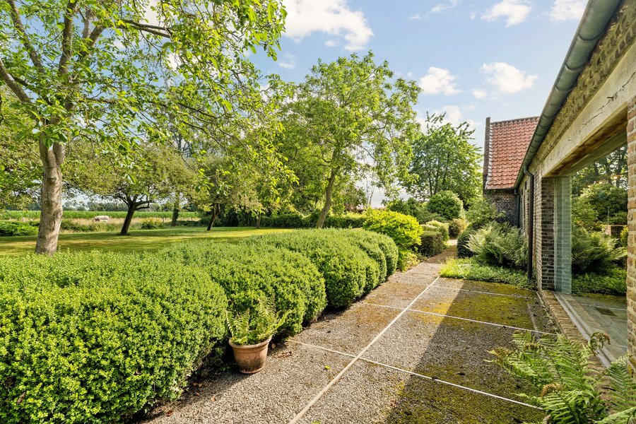 De tuin is volledig afgestemd op de architecturale visie van de woning. Elk element, van het tuinpad tot de aanplanting, ondersteunt de rustige, verstilde sfeer. Het erf, omgeven door historisch volume, creëert een gevoel van beslotenheid en rust.