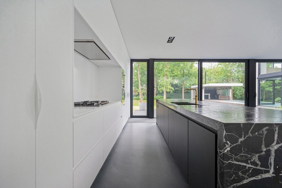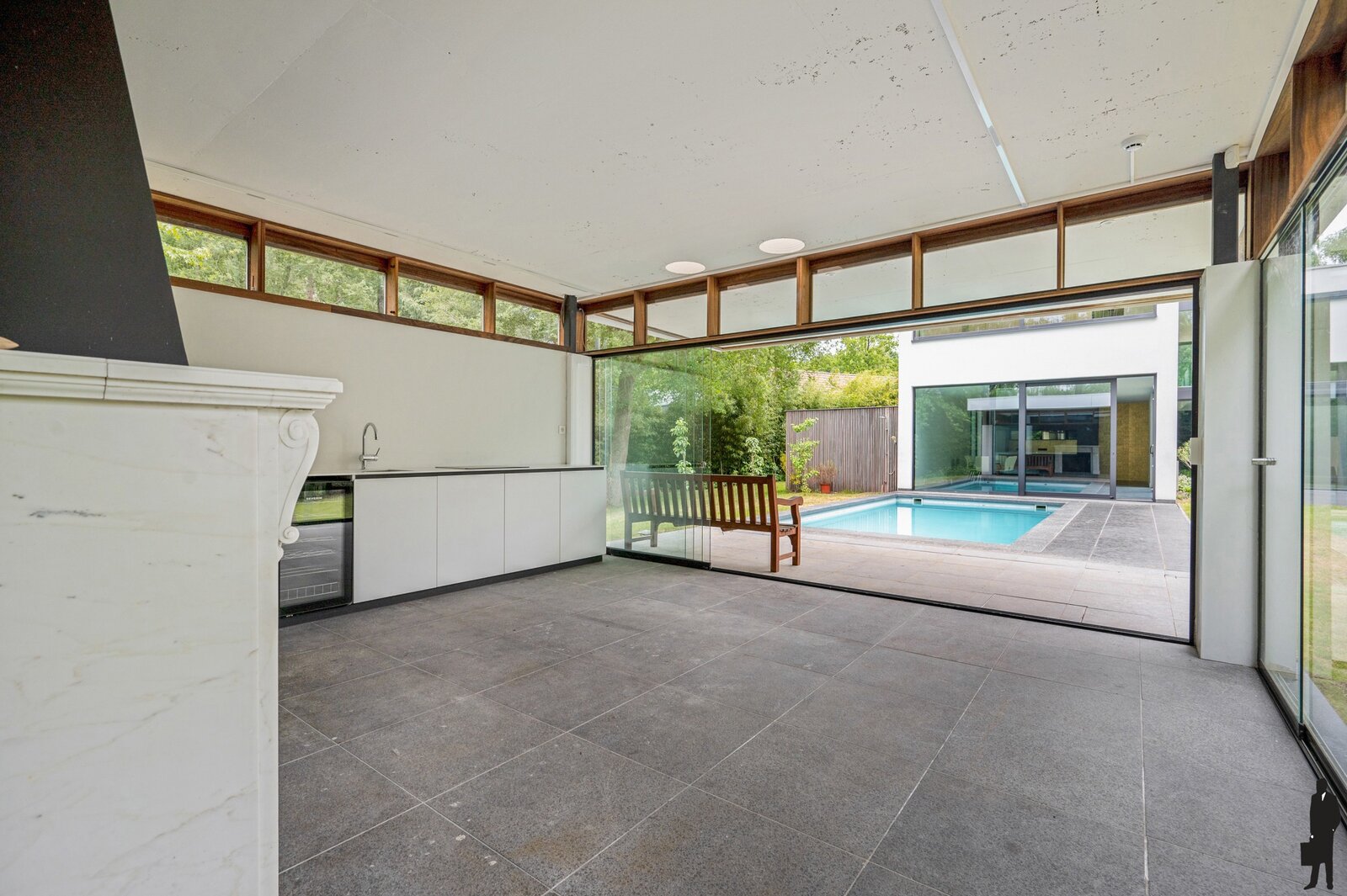 - Een poolhouse met volledig openschuifbare glazen wand die naadloos aansluit op terras en zwembad, inclusief keuken voor een ultieme buitenlevenbeleving, bestaande uit een lavabo, Severin wijnkoeler, Novy inductiekookplaat