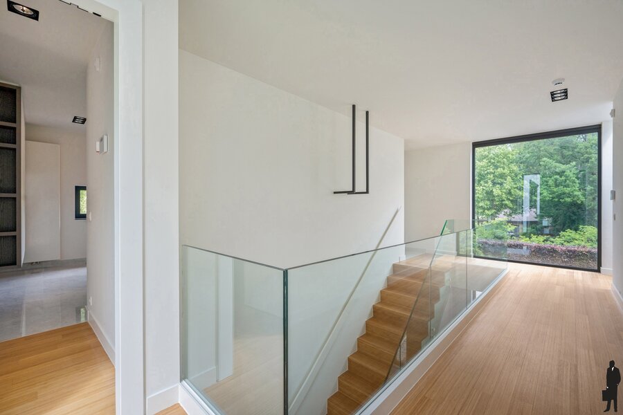 - Een hoofdsuite, bereikbaar via veiligheidsdeur: ruime slaapkamer op parket met schuifraam, dressing met indirecte verlichting en luxueuze badkamer met centraal bad, inloopdouche, dubbele lavabo en apart toilet