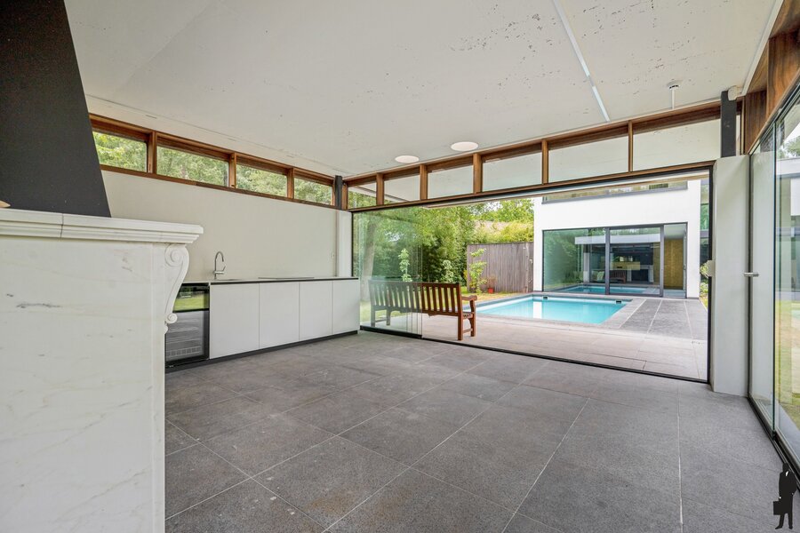 - Een tweede leefruimte met zicht op het zwembad en terras, inclusief stijlvolle bar met KitchenAid ijsmachine, gootsteen en Miele koelkast en kelderluik naar wijnkelder.