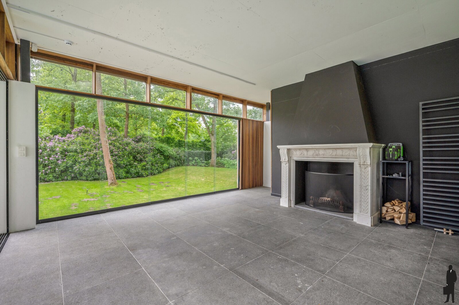 - Een eetkamer/leefkeuken met transparante gashaard, dubbele schuiframen: directe toegang tot terras en tuin