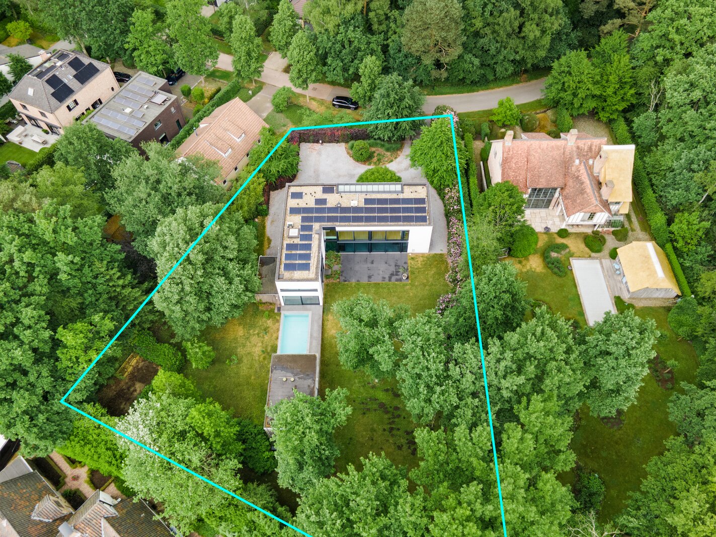 - Een zeer ruime oprit met automatische poort, laadpaal, en parkeergelegenheid voor meer dan 6 wagens