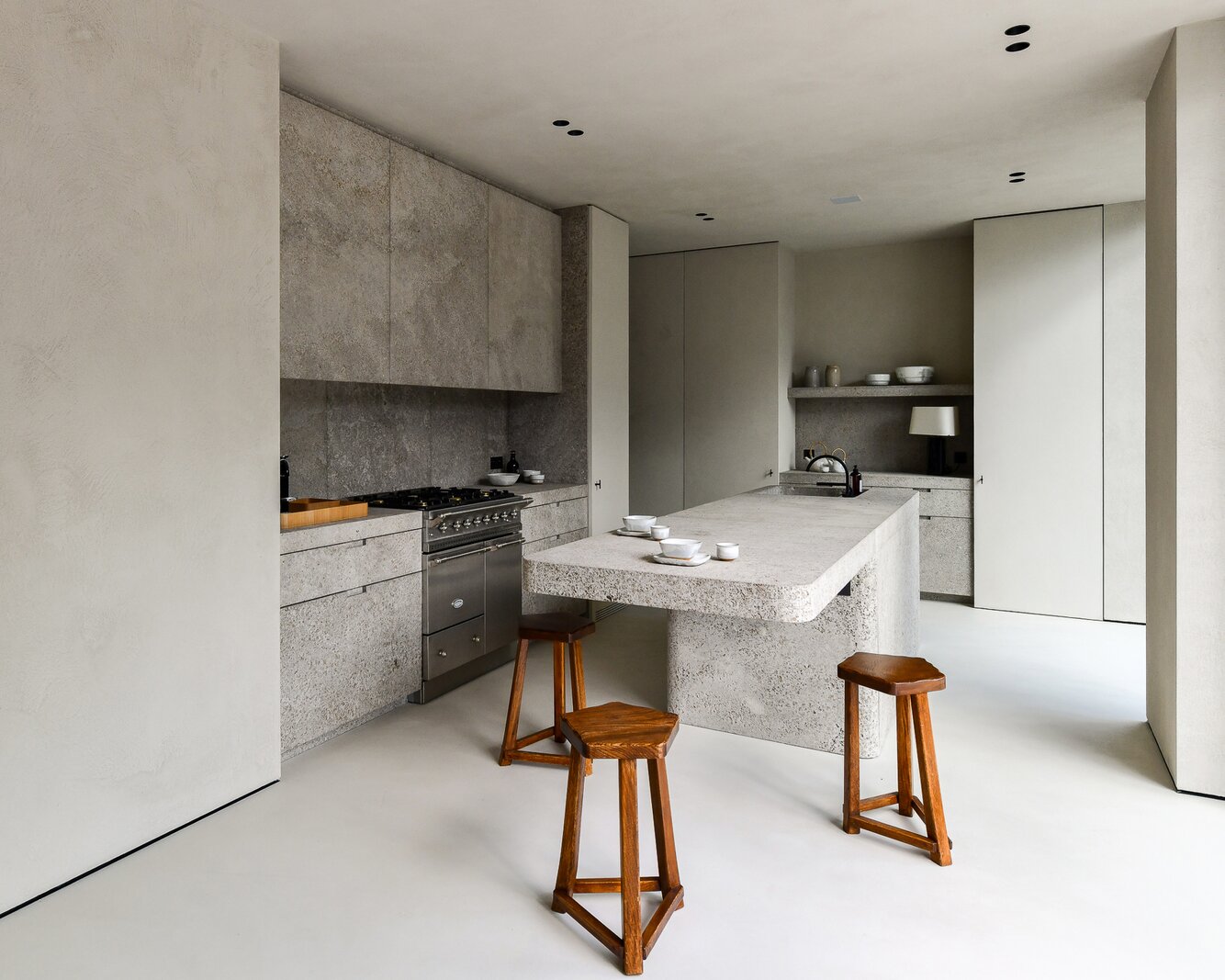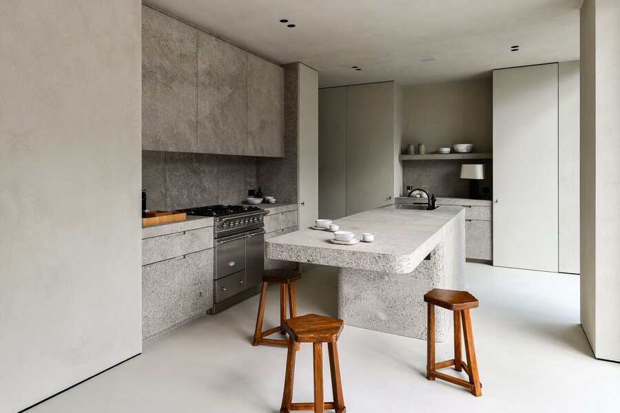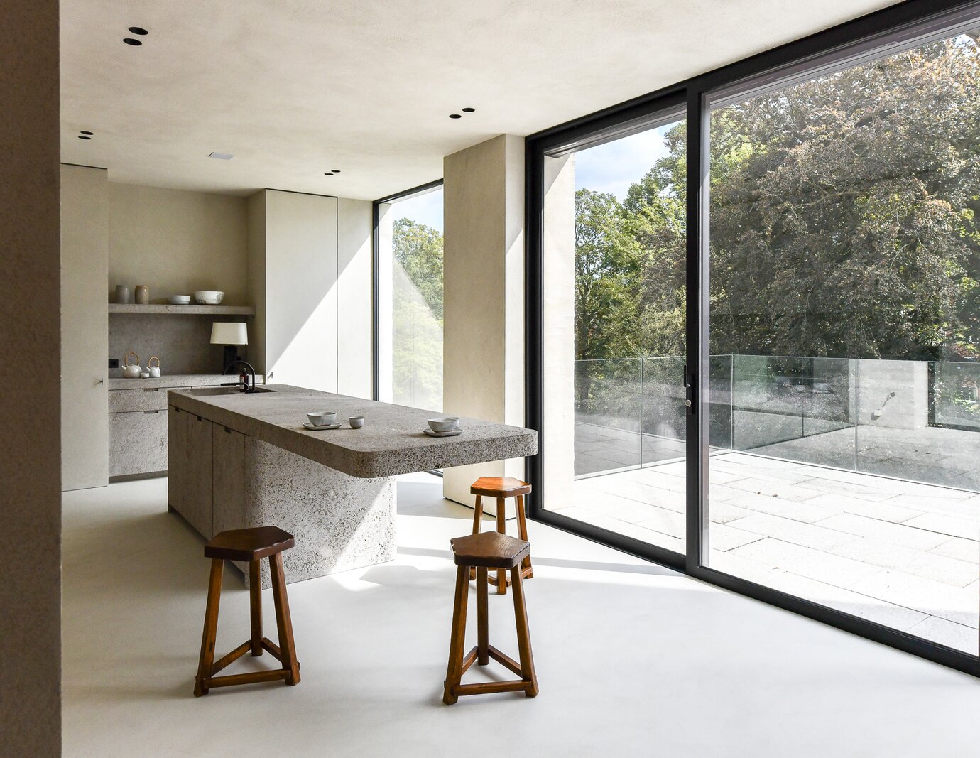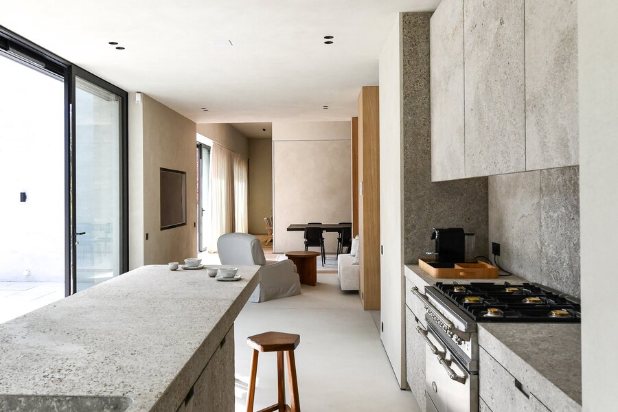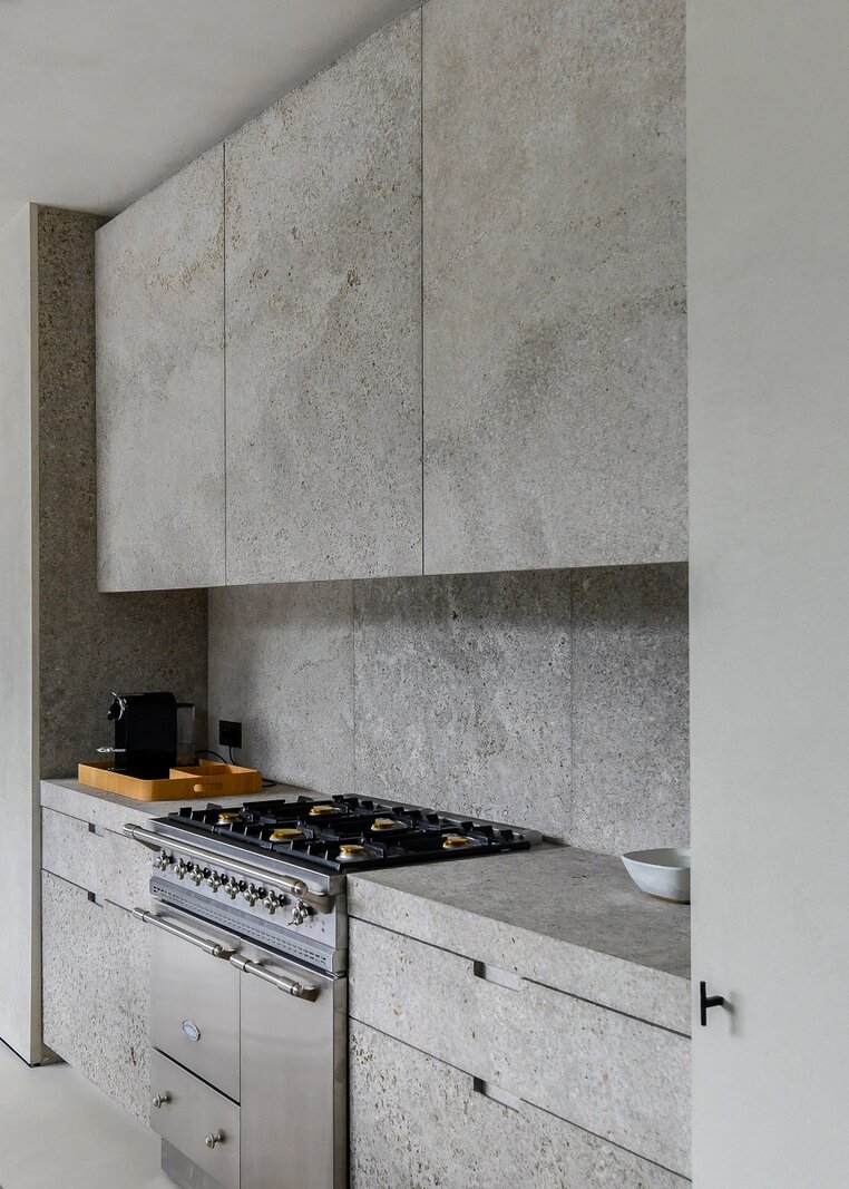 De verfijnde luxueuze leefkeuken, afgewerkt in travertin, baadt in natuurlijk licht en kijkt op de groene omgeving. Ingebouwde hoogwaardige apparatuur maken en een Lacanche kookfornuis. Een zeer gerieflijke bijkeuken.