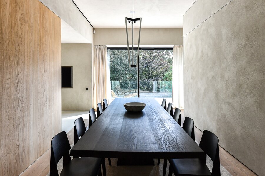 Een ruime en lichtrijke leefruimte met open gashaard en bijzondere parketvloer. Hoge plafonds van wel 3,5 meter geven bijzonder cachet aan de ruimte, dat in combinatie met bijzonder verfijnd buitenschrijnwerk om het daglicht overvloedig te ontvangen en het ruimtegevoel extra te versterken. Een semi afgescheiden grote eetgelegenheid gaat eveneens mee over tot het royale, zonovergoten privéterras, dat uitkijkt op groene boomkruinen en biedt een oase van rust.