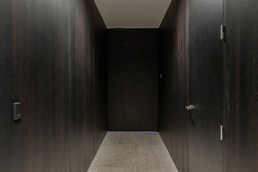 De beveiligde lift leidt u privatief tot in het appartement. Inkomhal met vestiaire en gastentoilet.