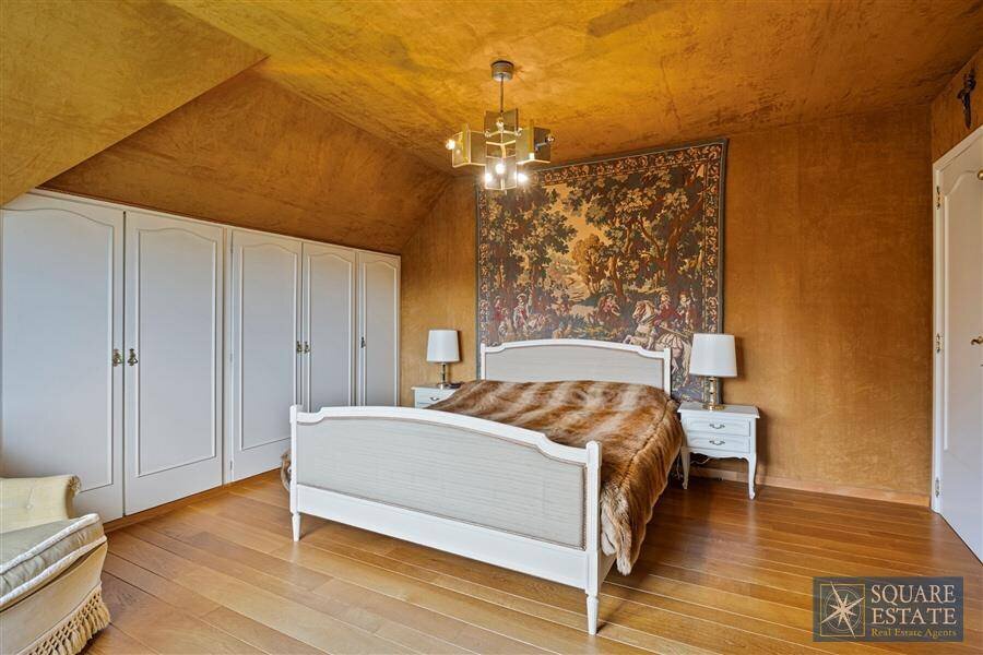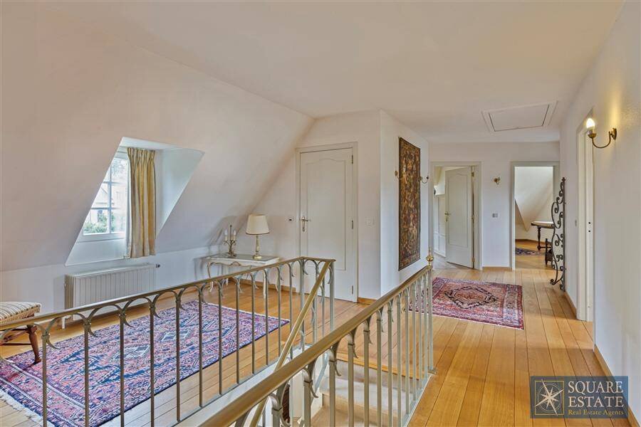 Op de verdieping leidt een ruime nachthal met prachtig massief eiken parket naar een master suite met eigen badkamer, drie grote slaapkamers, een kleine kamer, een tweede badkamer en een doucheruimte.