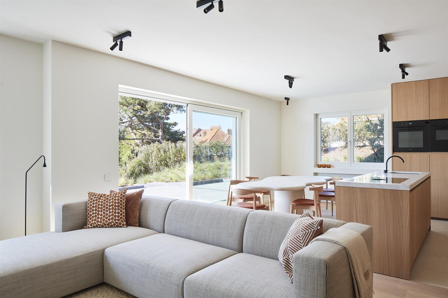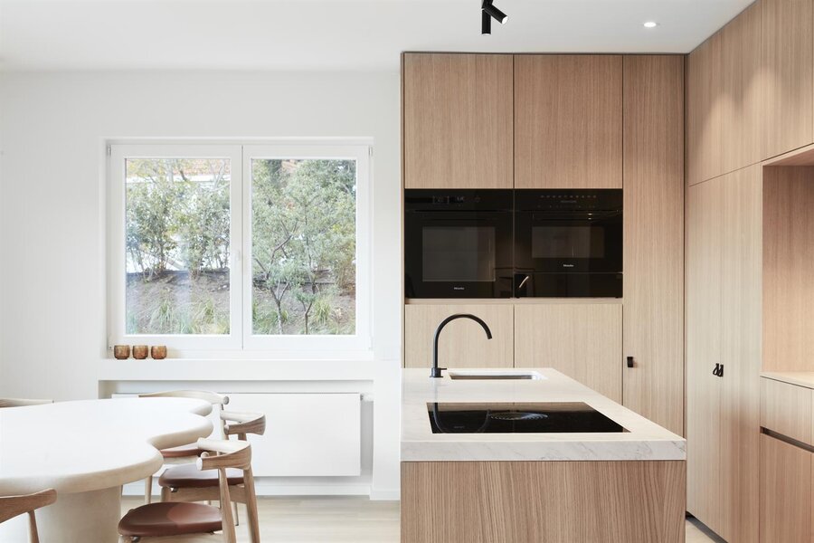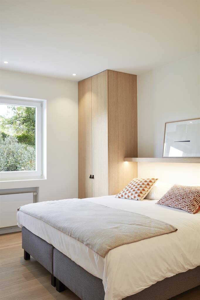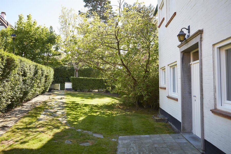 Afwerking: top kwalitatieve renovatie door Quality Properties, zowel technisch als naar materialen toe. Interieur in zachte lichte tinten, combinatie van eik fineer, carrara marmer, beton ciré en geolied eik parket. Open haard op hout, subtiele verlichting, Bticino domotica en schakelmateriaal. Overal rolluiken. Tuin door Dominique Eeman met automatische besproeiing.