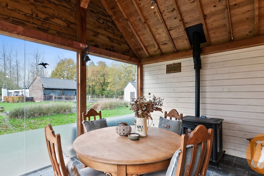 Binnen straalt de woning rust en stijl uit. De leefruimtes vloeien naadloos in elkaar over en baden in natuurlijk licht dankzij de grote raampartijen die het omliggende landschap letterlijk binnenhalen. De keuken, die zelfs werd opgenomen in Landelijk Wonen, combineert traditioneel vakmanschap met moderne luxe en is afgewerkt met onder meer Rouge Belge-marmer en authentieke vloertegels. Het hart van het huis is ongetwijfeld de sfeervolle zithoek, waar een houtkachel voor warmte en gezelligheid zorgt, perfect voor knusse avonden met zicht op de tuin.
