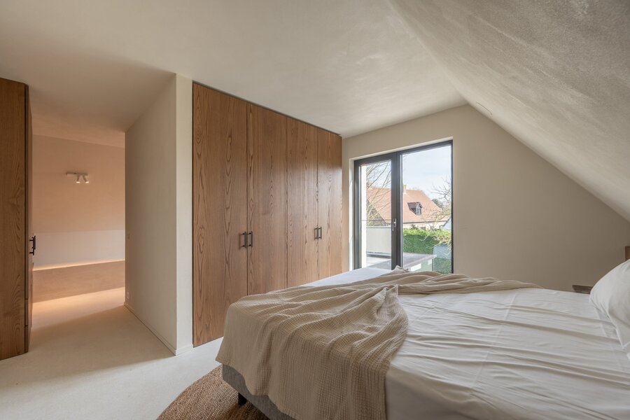 Masterbedroom met zicht op groen en voorzien van inloopdressing, volwaardige badkamer en suite met ligbad, inloopdoche, wc en dubbele lavabo.