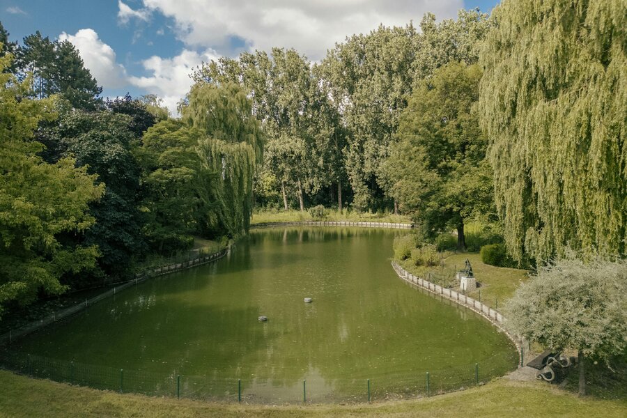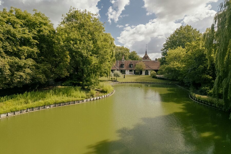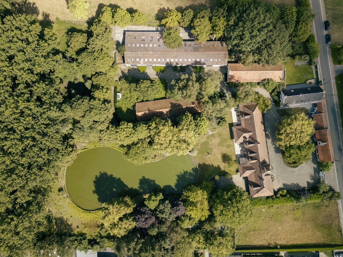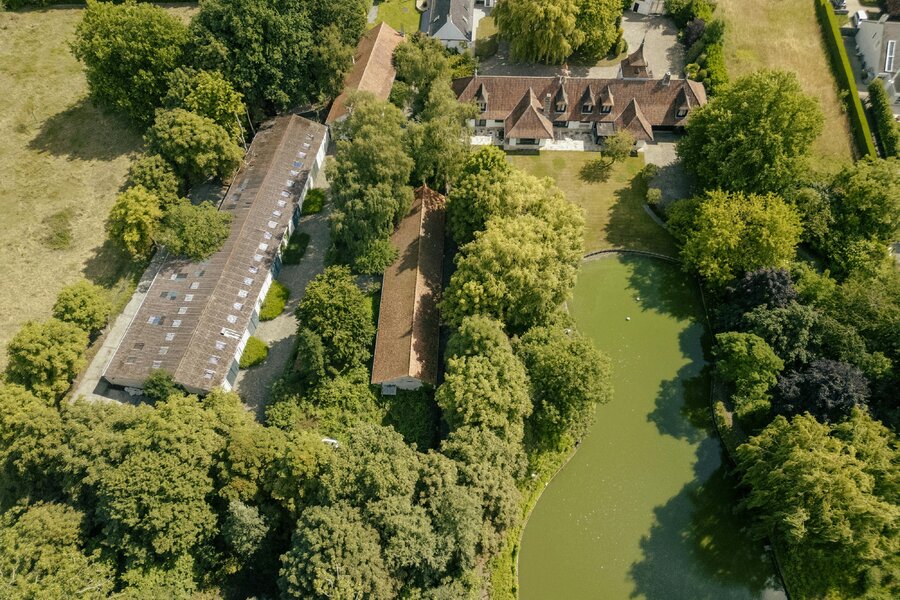 De leefruimtes kijken uit op de grote vijver en het omliggende parkdomein, wat zorgt voor een permanent vakantiegevoel. De binnenkoer, omsloten door de gebouwen, tuinmuur en toegangspoort, biedt absolute privacy en een bijzondere sfeervolle beleving.