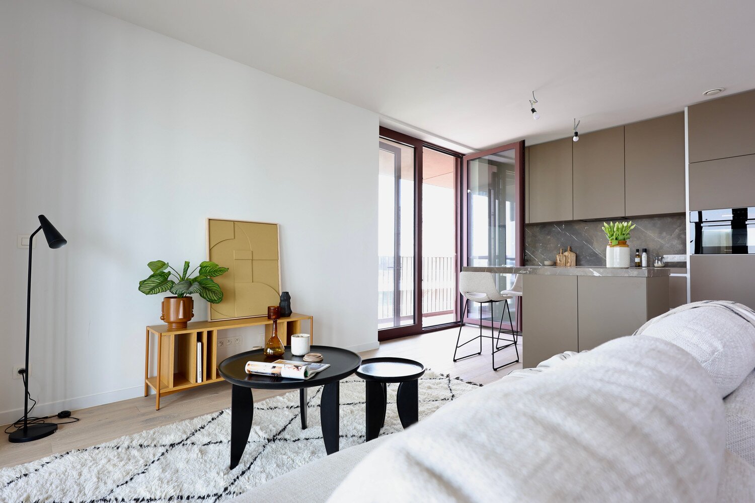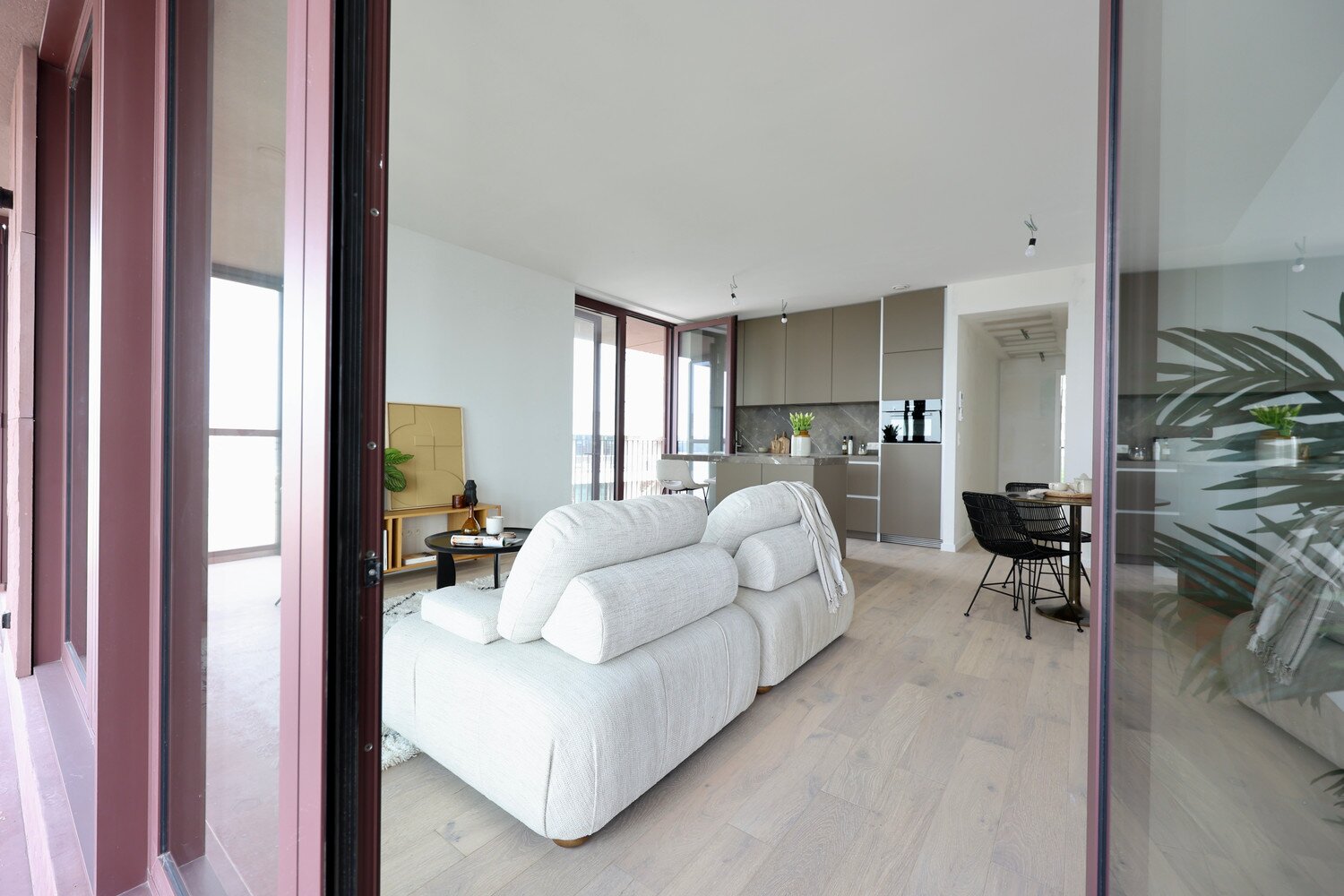 Het appartement is gelegen op de 5de verdieping. De lichte leefruimte vloeit naadloos over in een royaal terras met adembenemende zichten over de Schelde, Kaaien en de Stad. Een open keuken met natuurstenen afwerking (Bulthaup )biedt alle comfort. De mastersuite omvat een slaapkamer met aansluitend dressing en badkamer (nog in te richten naar keuze).