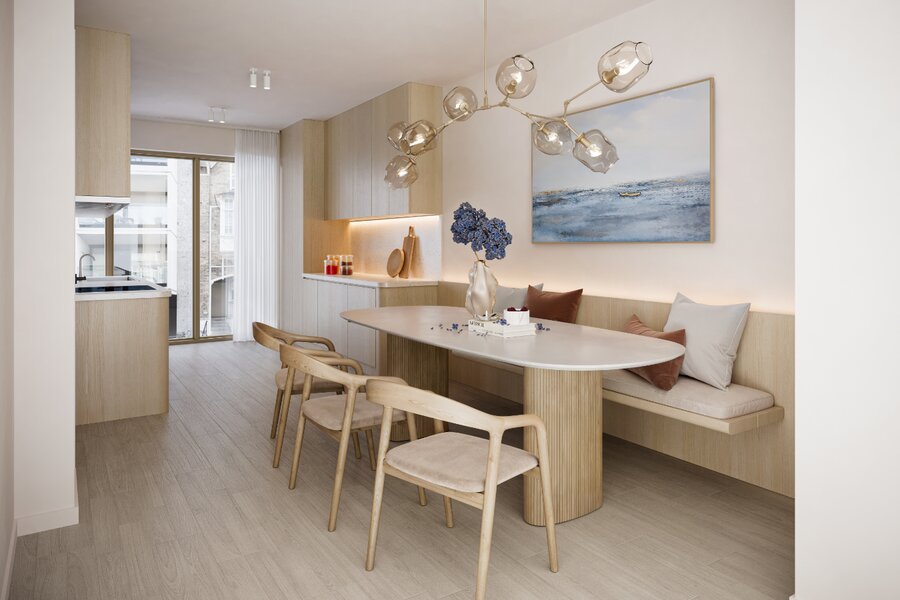 Lichtrijke leefruimte met aansluitend een gezellig buitenterras. De halfopen keuken sluit mooi aan bij de eetruimte. Verder beschikt het appartement over twee ruime slaapkamers die een aparte badkamer en een afzonderlijk toilet delen op de nachthal.
